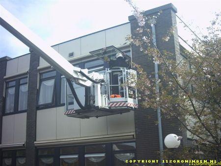 De brandweer heeft met een hoogwekker één van de slachtoffers via het raam naar buiten gehaald.