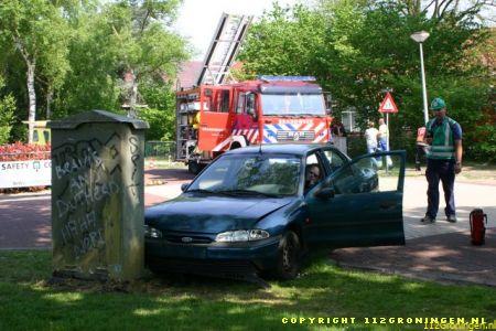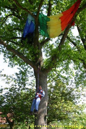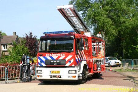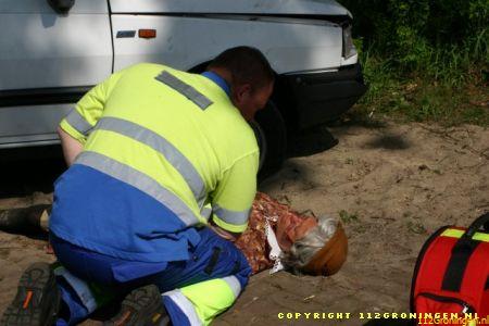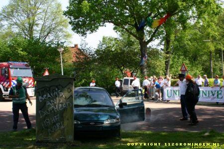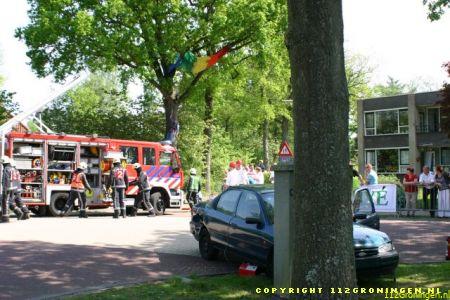 Het betrof hier een vrij gecompliceerde inzet. Twee auto’s zijn met elkaar in botsing gekomen nadat er plotseling een parachutist uit de lucht kwam vallen. De witte auto knalt tegen de boom waar de parachutist in blijft hangen. Ook komt er een voetganger onder deze auto. De groene auto schiet over het kruispunt en ramt een stroomkast, hierdoor komt de auto onder stroom te staan. Al met al zijn er dus vier slachtoffers die allemaal de nodige aandacht vragen. Op de foto’s is brandweer Smilde aan het spelen.