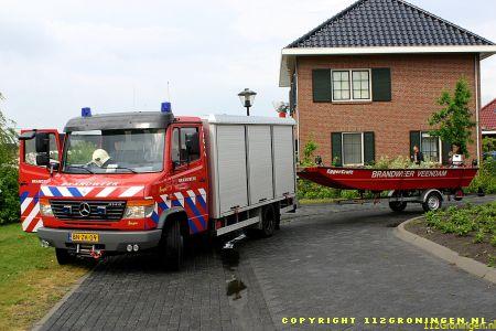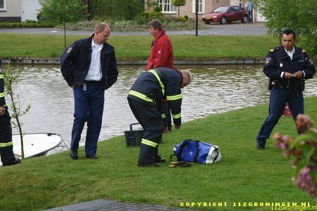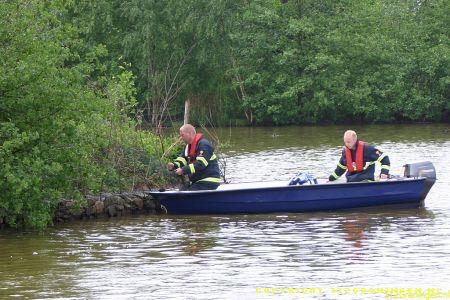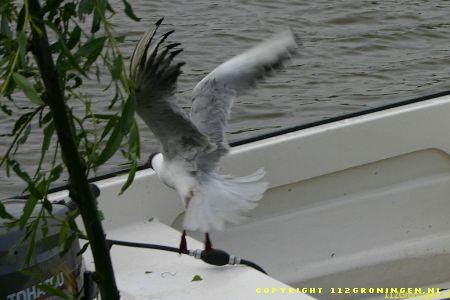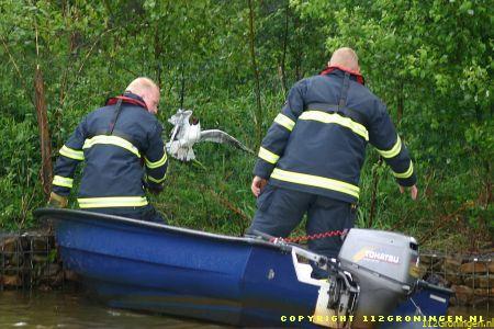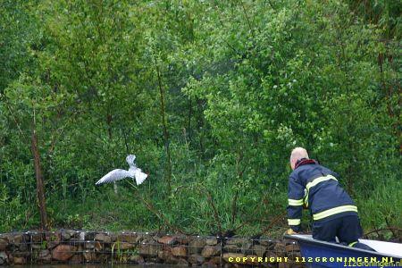 Oftewel een kokmeeuw ! Brandweer Veendam werd hiervoor rond 10.30 uur geallarmeerd. Op een eilandje tussen de Nijlgans en de Kolgans in de wijk Langebosch te Wildervank was het beestje verstrikt geraakt in een net dat langs de oever was gespannen. De brandweer kwam met de HV-2 + boot terplaatse. Doordat een buurtbewoner zijn boot beschikbaar stelde kon de boot van brw. Veendam op het droge blijven. Twee brandweermannen stapten in het bootje om de vogel te bevrijden. De losgemaakte vogel werd in een tas gestopt en meegenomen naar het vaste land. Daar aangekomen werd de tas geopend om de vogel te bekijken, maar voor dat men er erg in had was de vogel gevlogen(zie laatste foto). Nadat men de vogel had bevrijdt werd het net verwijderd om te voorkomen dat er meer vogels in verstrikt raken.