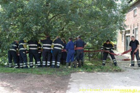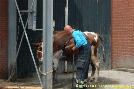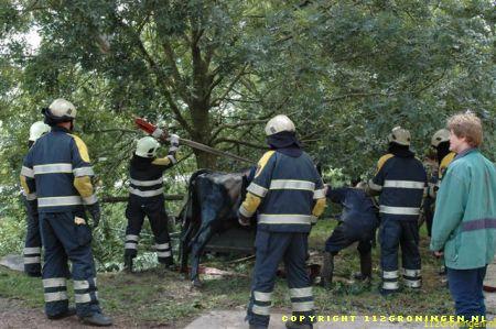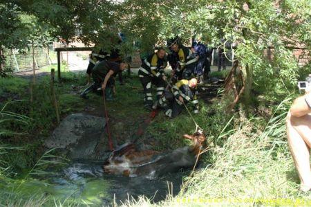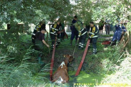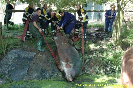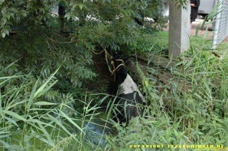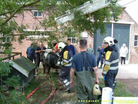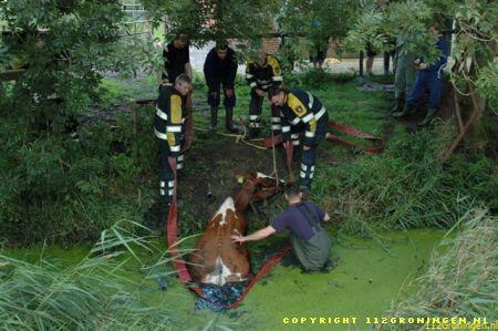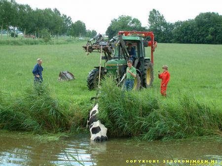 Ter plaatse gekomen bleken er twee koeien in een sloot te zitten en konden er niet zelfstandig meer uitkomen. Ook de eigenaar lukte het niet en heeft toen de brandweer gealarmeerd. De brandweer heeft later assistentie gevraagd van de HV uit Delfzijl. De eerste koe kon men met behulp van een brandslang uiteindelijk uit de sloot krijgen. De tweede koe is met behulp van de kraan op de hulpverleningsvoertuig uit de sloot getrokken. De koeien die al een tijdje op stal stonden waren net buiten gezet om te wennen maar stapten beiden de sloot in. Waarschijnlijk kwam het doordat de sloot vol kroos zat en dus net grasland leek. Om 13:00 uur was de klus geklaard en konden beide voertuigen weer naar de kazerne. Video vannacht online.