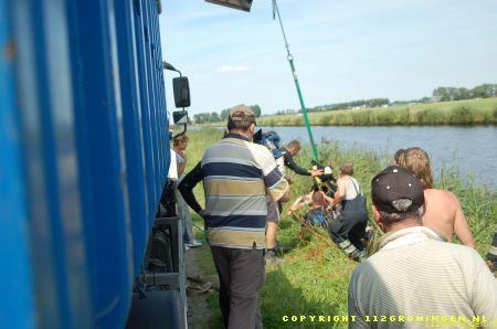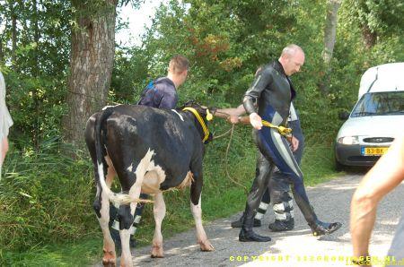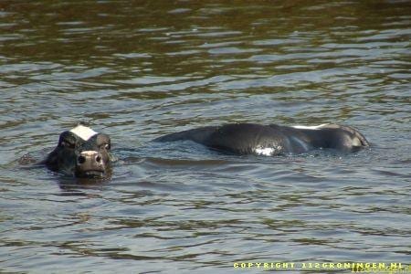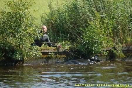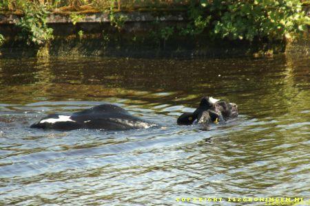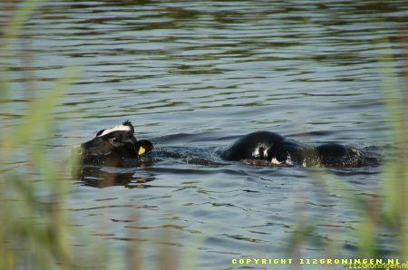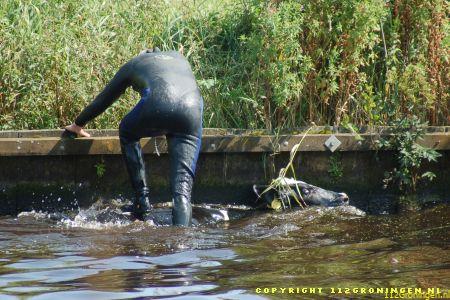 Aduard – Woensdagmiddag om 14:30 raakte een koe te water in een kanaal aan de Albert Harkemaweg in Aduard. Eerder op de dag was er ook al een ree te water geraakt op nagenoeg dezelfde plek. De toegesnelde brandweer trof een zwemmende koe aan die aan het zwemmen was voor haar leven. Twee brandweermannen sprongen hierop in het water. Een voorbij rijdende vrachtwagen met kraan van de gemeente Zuidhorn schoot te hulp waardoor de HV-wagen van Groningen binnen kon blijven. In ongeveer 30 minuten was het dier weer op het droge.