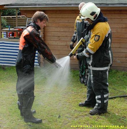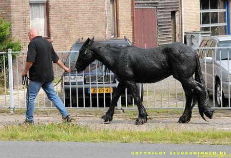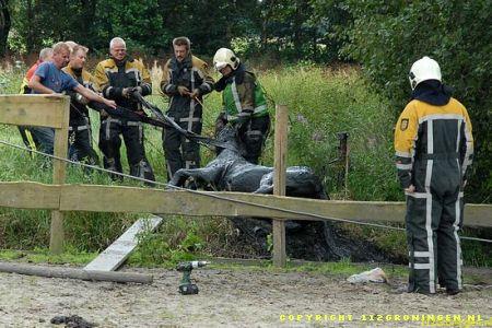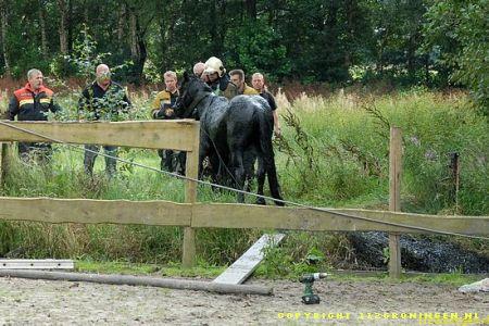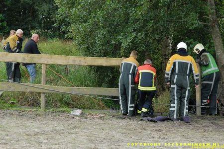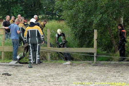 Peize – Aan de Groningerweg te Peize is zaterdagmiddag een paard te water geraakt. Aangezien de eigenaar het paard er niet zelf uit krijgen kon werd de brandweer ingeschakeld. Aangezien het paard in een sloot naast een paardenbak lag, heeft de eigenaar voor aankomst van de brandweer een deel van de bak gedemonteerd, hierdoor kon de brandweer makkelijker bij het paard komen. Bij aankomst ging een van de brandweerlieden in duikpak te water om de slangen achter het paard langs te leggen, hierna werd met man en macht gewerkt om het paard uit de sloot te krijgen. Het geheel werd bemoeilijkt doordat het een behoorlijke blubbersloot was, en omdat het paard erg vast zat.