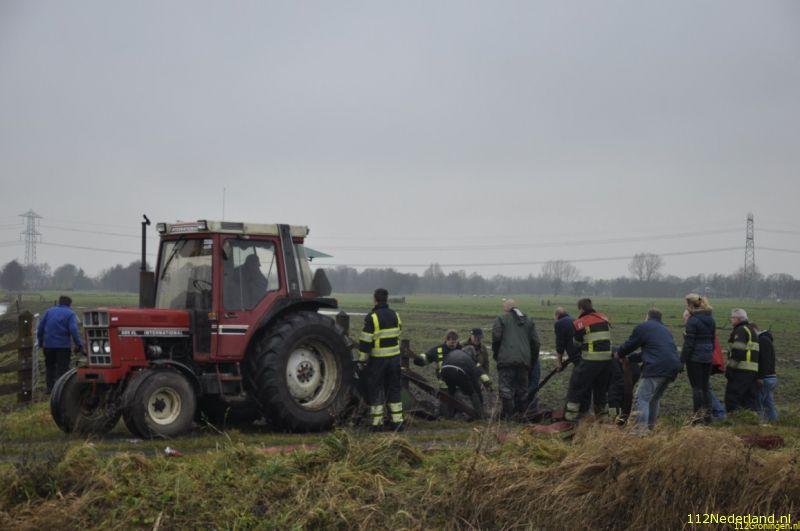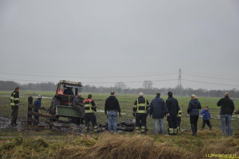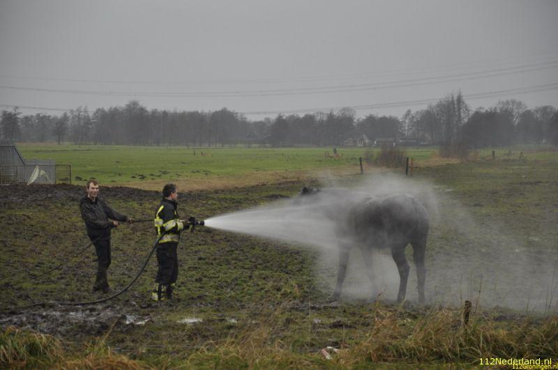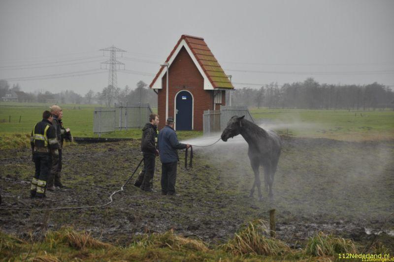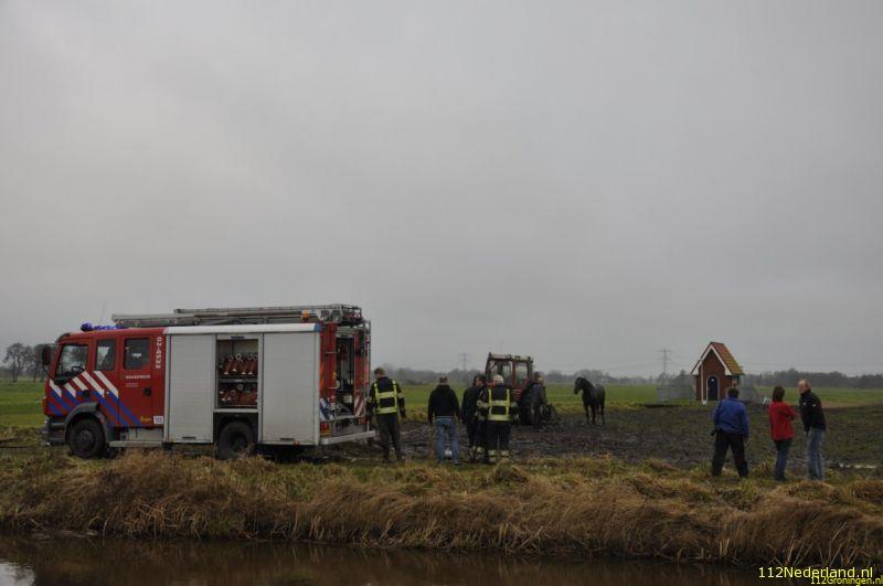 Een boer had zich bekommerd om een paar paarden die al een tijd in een weiland bleken te staan en kwam vandaag tot de ontdekking dat een van de paarden in de sloot was beland. Regelmatig werden de paarden waarvan de eigenaar er niet meer voor kan zorgen bezocht door een paar boeren uit de omgeving die ze dan eten gaven. De brandweer van Surhuisterveen is samen met een paar boeren, omstanders, fotograaf bezig geweest om het dier uiteindelijk met behulp van een tractor op het droge te krijgen, na 1,5 uur hadden ze resultaat. Na grote inzet van deze mensen stond het dier weer op z`n benen, werd afgespoten en daarna naar een warme stal in Opende gebracht.