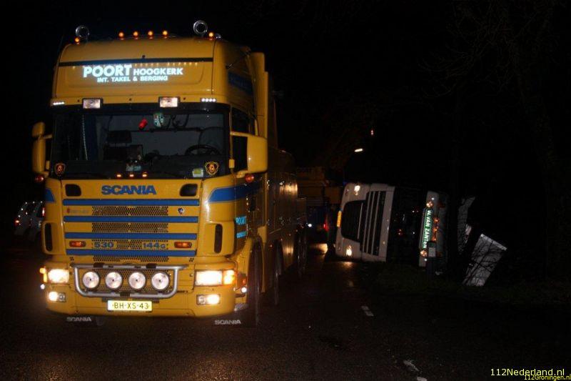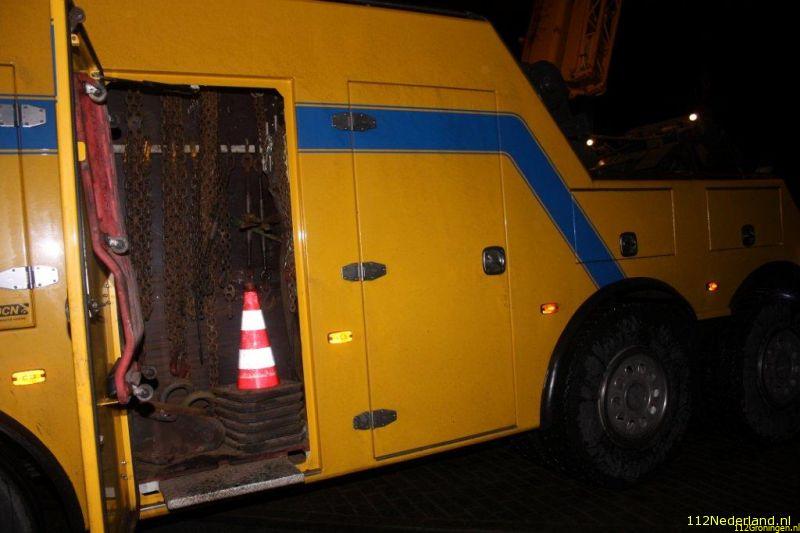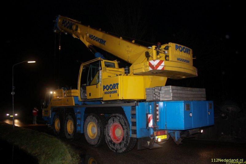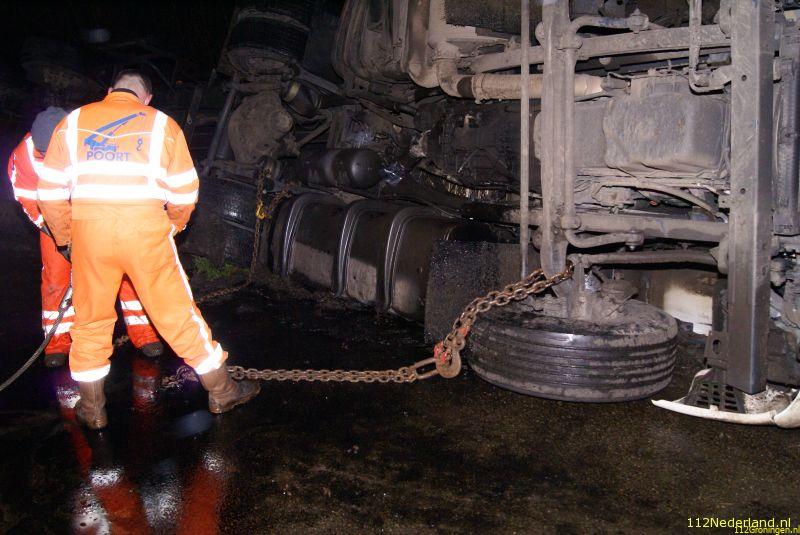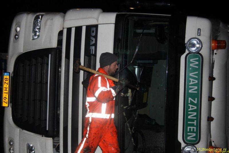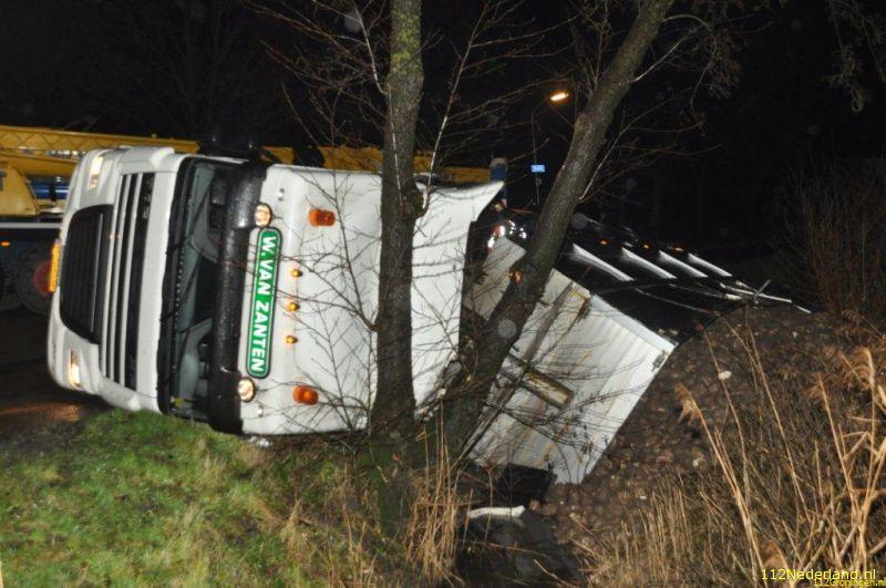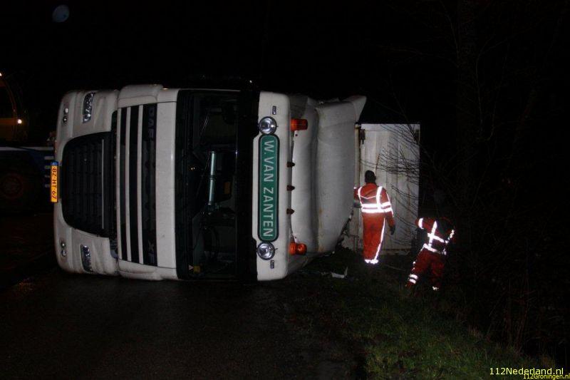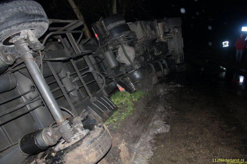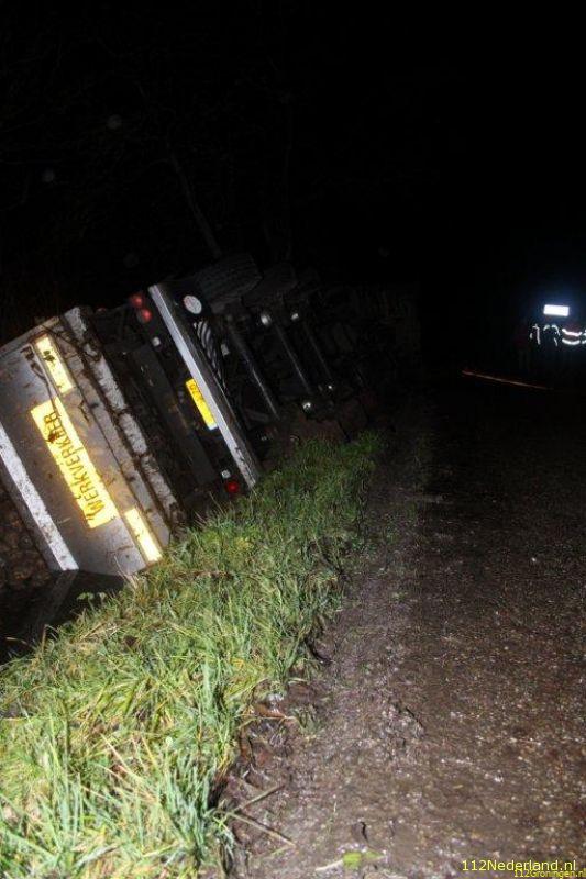 De vrachtwagen zou gaan draaien en is daarbij met de assen over de rand gekomen.De vrachtwagen was net 300 meter terug geladen met suikerbieten. De weg is 3 uren gestremd geweest. Berger Poort heeft het voertuig getakeld en geborgen.
