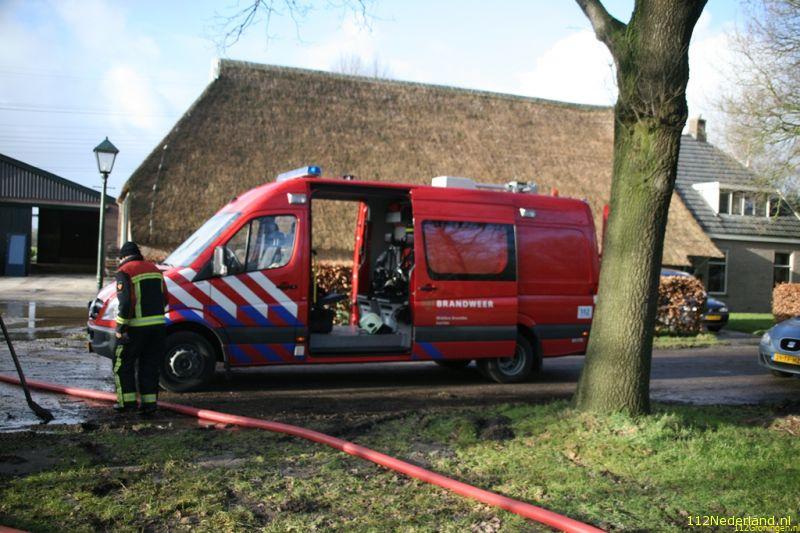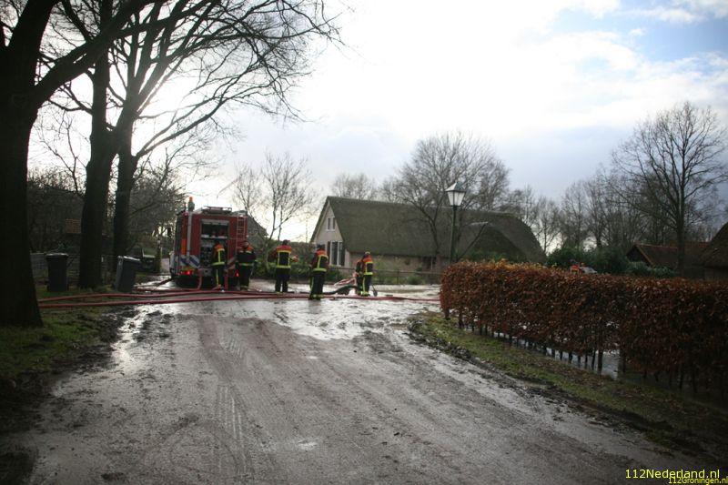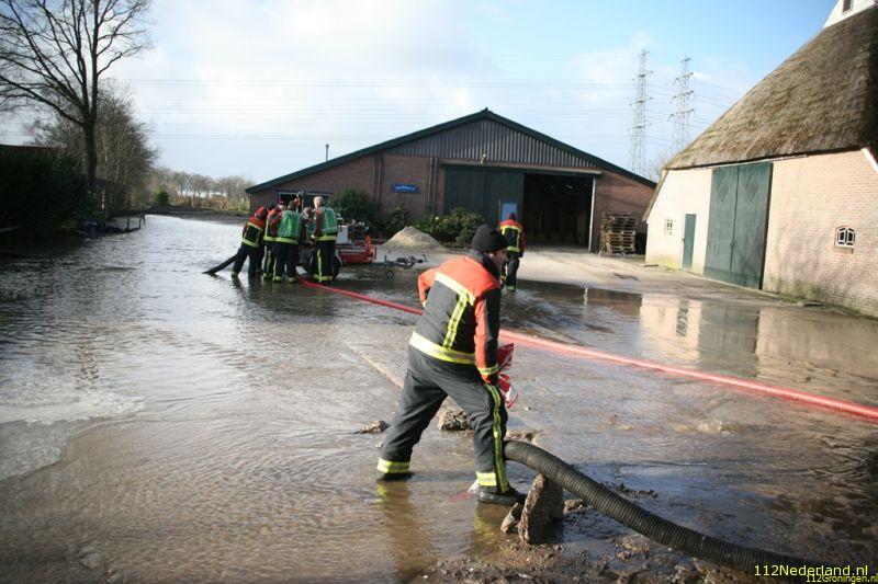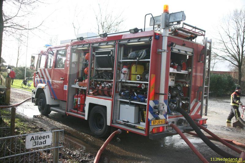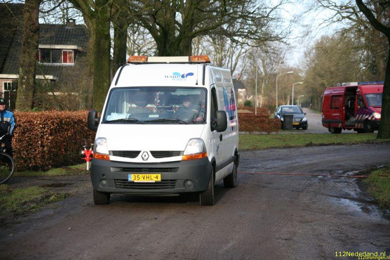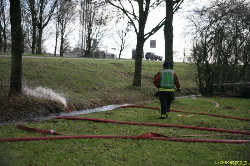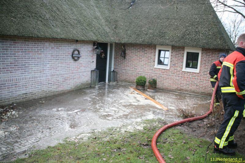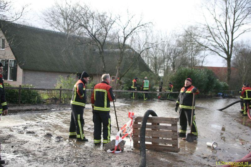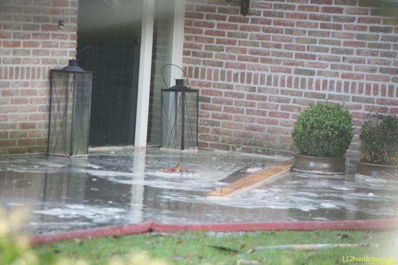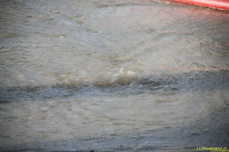 Daarbij zou een woning door het water worden bedreigd. De brandweer kwam met twee voertuigen ter plaatse. Hier bleek door onduidelijke redenen een waterleiding geknapt te zijn waardoor het water door de betonplaten omhoog kwam. Een naastgelegen woning die wat lager lag kwam hierdoor in het water te staan. De bewoners verklaarden dat er in de woning een lading water stond van ongeveer 15 cm hoog. De brandweer heeft met 2 voertuigen geprobeerd het water in de naastgelegen sloot te pompen terwijl de waterleidingmaatschappij op zoek ging naar de afsluiter.
