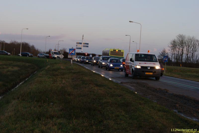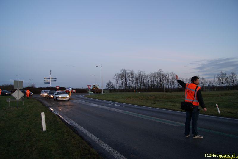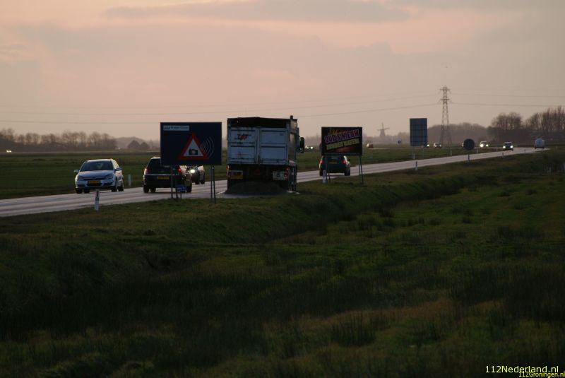 De kiepauto kwam bij de Waterzuiveringsinstallatie in Dokkum vandaan, waar hij een deel zand/bagger had meegenomen. Op de rotonde bij de kruising met de Murmerwoudsterweg ging het mis. De kiepauto z’n laadklep hield het zware zand, doorweekt met water niet langer en sprong voor een gedeelte open. De chauffeur heeft de wagen zo snel mogelijk op de eerste pechstrook geparkeerd en heeft het serviceteam van het bedrijf gebeld. Zij schoten de chauffeur te hulp, evenals een shovel van het bedrijf. Twee fotografen leidden het verkeer in goede banen, zodat de shovel zijn werk kon doen.