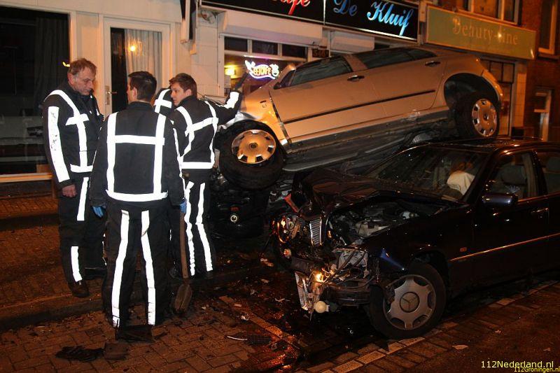 De auto kwam door de klap boven op de geparkeerde auto terecht. Ook een parkeermeter op de stoep ging door de klap verloren. De hulpdiensten rukte direct uit voor een mogelijke beknelling. Daarom ging ook de brandweer met spoed op pad. Volgens getuigen vluchtte de bestuurder uit zijn auto. Drie omstanders hebben de man overmeesterd en overgedragen aan de politie. De schade aan de voertuigen is enorm.