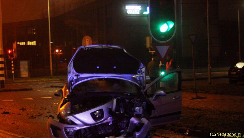 Emmen - Een gewonde woensdagavond op de met verkeerslichten beveiligde kruising Boermarkeweg met de van Schaikweg in Emmen waar twee auto's met elkaar in botsing kwamen.