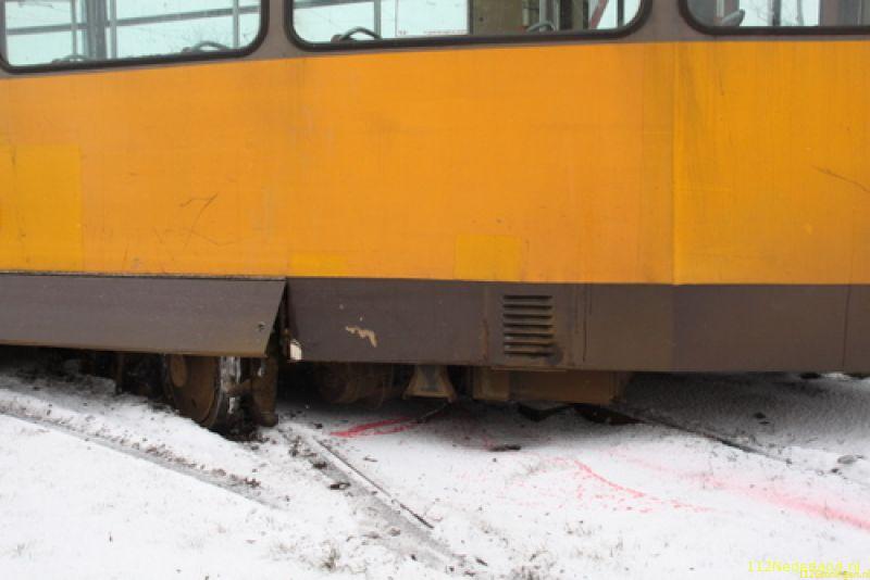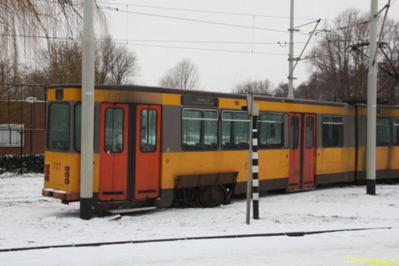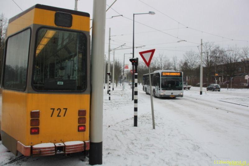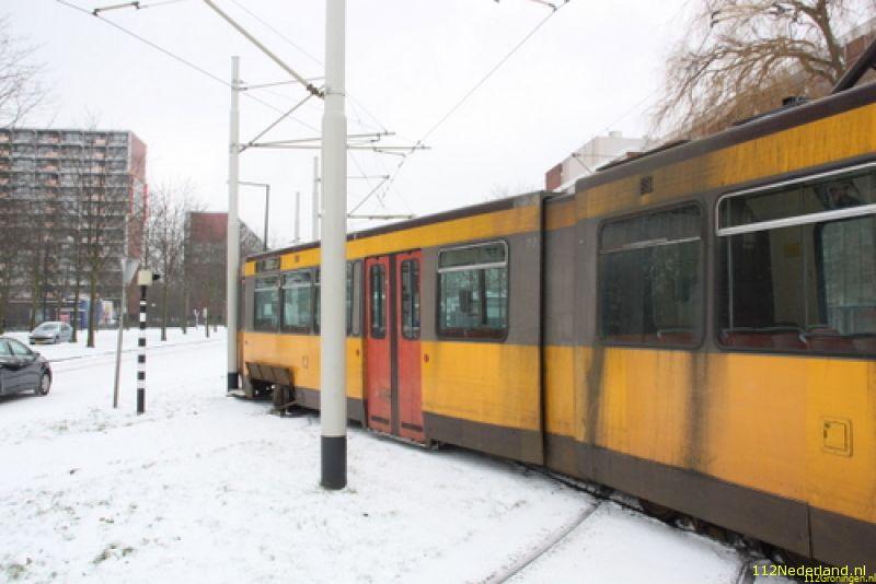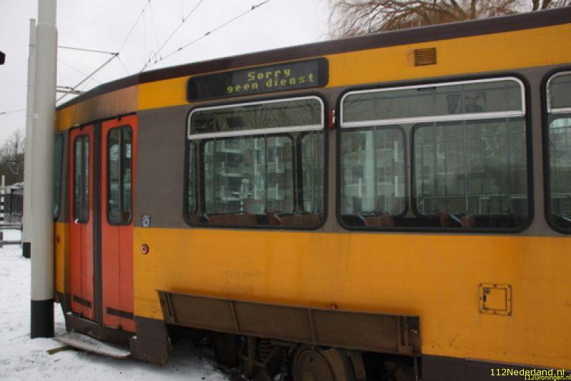 Vlaardingen - Door de sneeuw is vrijdagmiddag op de Holysingel in Vlaardingen een tram van lijn 23 uit de rails gereden.