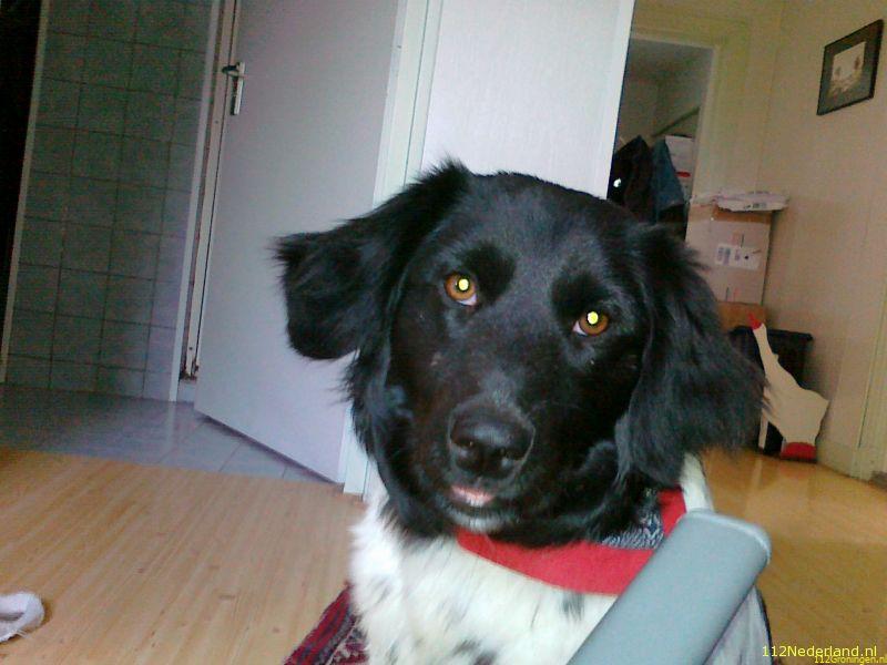 Ze heeft een rode halsband met rode zakdoek om. En ze is gechipt.