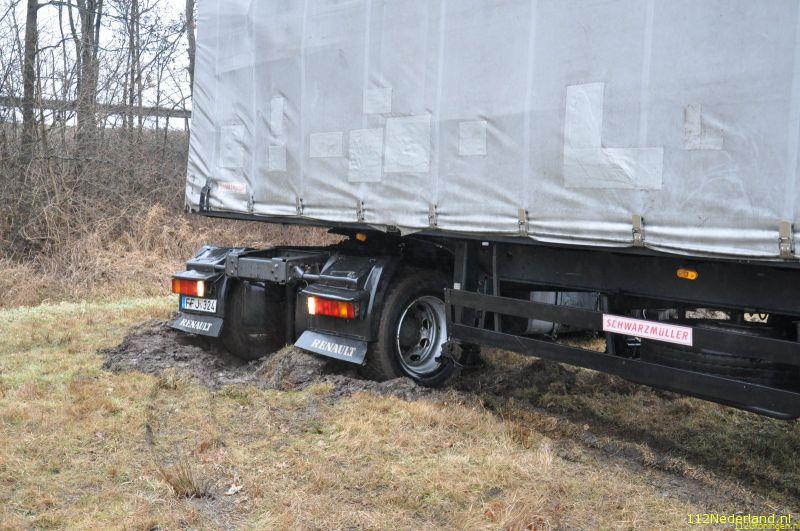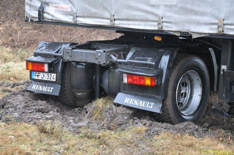 De chauffeur die wou keren op de carpoolplaats is in het door opdooi drassige gras vast komen te zitten. Een collega chauffeur heeft nog getracht om de vrachtauto los te trekken, maar zonder resultaat. De chauffeur heeft lange tijd moeten wacht op zwaarder materiaal om de auto weer vlot te trekken.