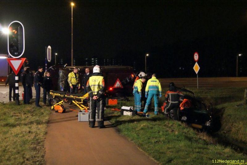 Om even voor half vier botsten een busje en een personenauto op elkaar op de kruising van de Burgemeester Bechtweg met de Stokhasseltlaan in het noorden van de stad. Het busje belandde op zijn kant en de auto raakte in de sloot. Het is niet duidelijk hoe het ongeval heeft kunnen gebeuren. De Verkeers Ongevallen Analysedienst heeft sporenonderzoek gedaan. Beknelling De bestuurster van de personenauto kwam met de schrik vrij. Een man die bij haar in de auto zat raakte bekneld en moest door de brandweer uit het voertuig worden geknipt. De bestuurder van het busje liep verwondingen aan zijn hand op. Wegafzetting De Burgemeester Bechtweg is een tijdje afgesloten geweest voor het verkeer. Een dronken bestuurder had hier weinig boodschap aan en reed in op de pionnen van de wegafzetting. De bestuurder is ter plekke aangehouden.