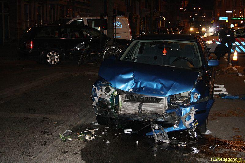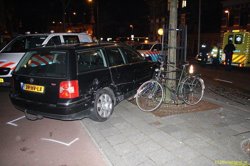 Een automobilist die de Blekerstraat in wou draaien werd op de kruising door een andere automobiliste in de flank geraakt. De afslaande auto draaide bijna 180 graden en eindigde de spin op het fietspad tegen een boom.