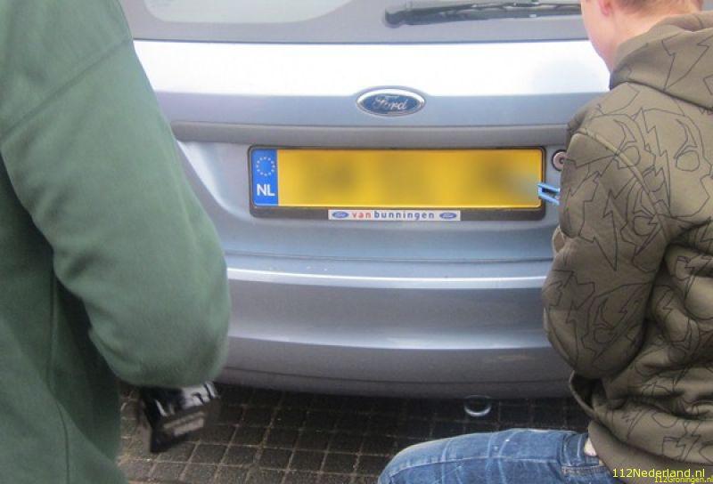 De aktie op op touw gezet door de politie, het Groene Hart College, de RDW en Rijsbergen automaterialen. De studenten voertuigentechniek van het Groene Hart College zetten de platen onder toeziend oog van het RDW en de politie voor u vast.