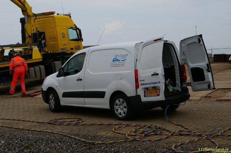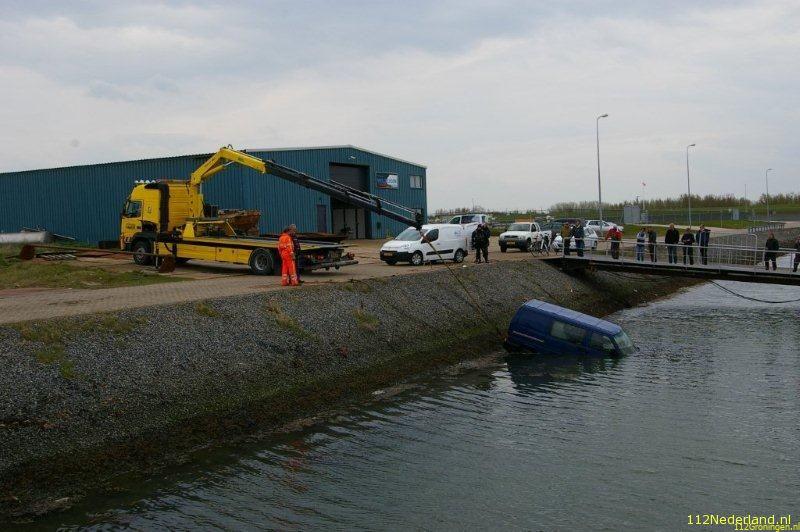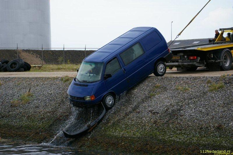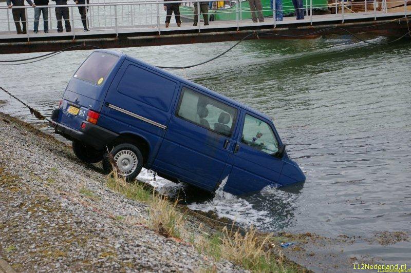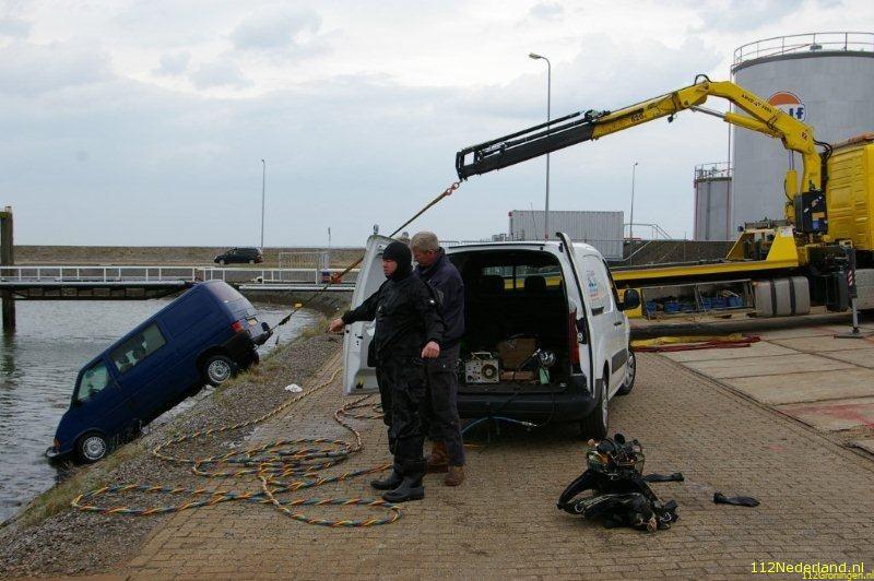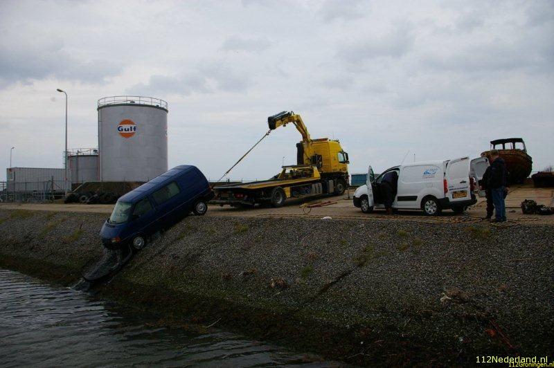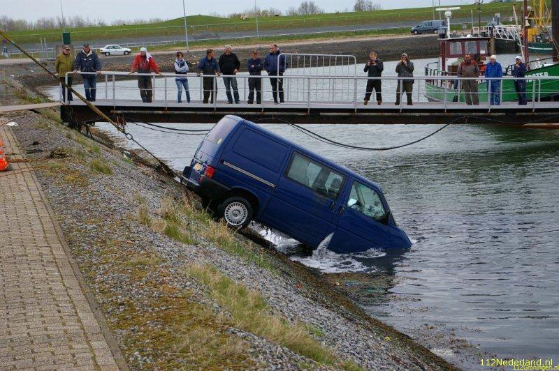 Lauwersoog - Op Scheepswerf Welgelegen raakte een bestelbus te water. De bestuurder had zijn bestelbus naast het gebouw geparkeerd op een schuin gedeelte en vergat hem op de handrem te zetten.