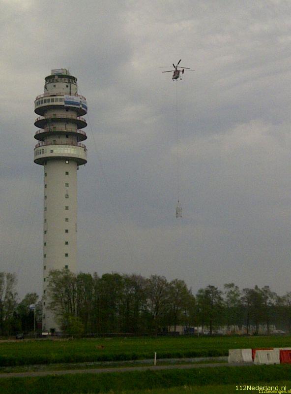 Hoogersmilde - Een ploeg van Heli Swiss is nu bezig in Hoogersmilde met het plaatsen van de zendmast op de betontoren.