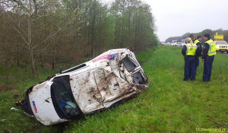 Gees - Een automobilist is vrijdagmiddag gewond geraakt bij een ongeval op de A37 bij Gees. De bestuurder van een bestelauto sloeg meermalen met zijn voertuig over de kop waarna de auto op de kop in de berm van de weg tot stilstand kwam.