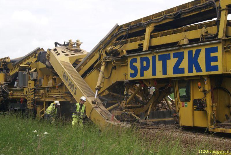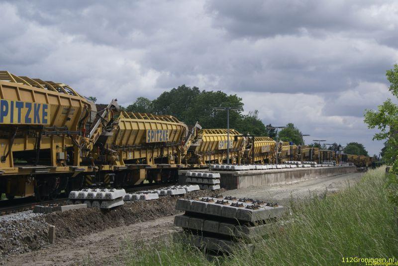 De Duitse onderhoudstrein is groot . Katharina legt in een uur maar 45 meter af, het grind onder het spoor wordt vervangen. Veel mensen nemen ene kijkje. Maandag is de klus als het goed is klaar.