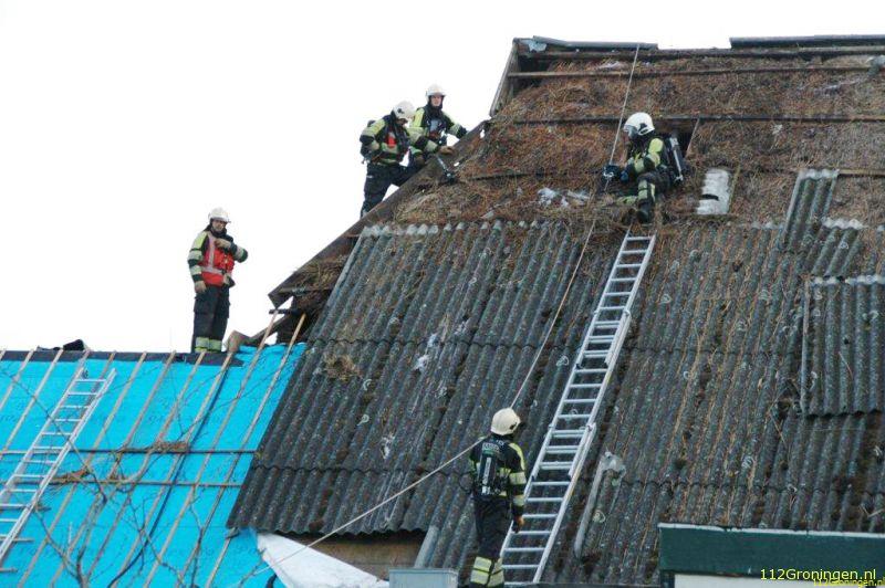 Een deel van het dak werd gesloopt om zeker te weten dat er geen brandhaard meer onder de platen zat. Met behulp van de hoogwerker werd een deel van de platen verwijderd. Ook is het riet nog even goed nat gespoten waarna de korpsen tegen half 7 weer richting de kazerne konden vertrekken. De schade aan het dak is aanzienlijk. Het voorhuis wat verbouwd wordt heeft geen schade opgelopen.