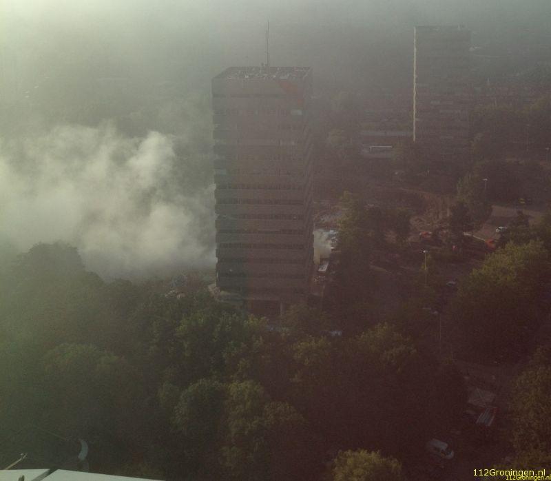 Groningen - Een containerbrandje aan de Kempkensberg in leverde woensdagmorgen een bijzonder plaatje op, gefotografeerd vanaf de 23e verdieping van het DUO-gebouw. En de container brandde voor de 2e keer.