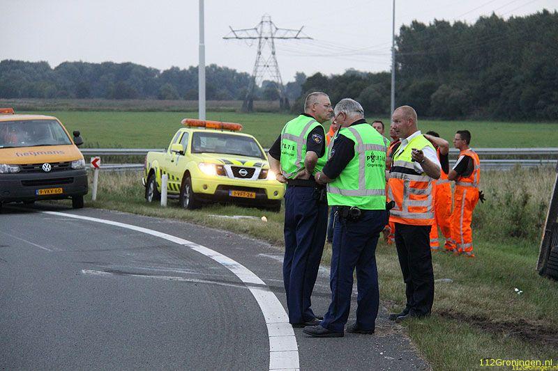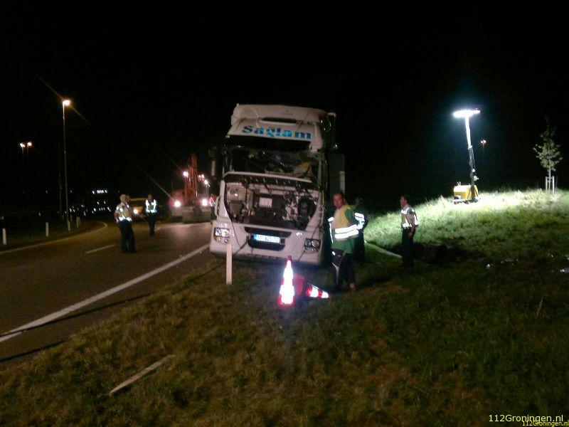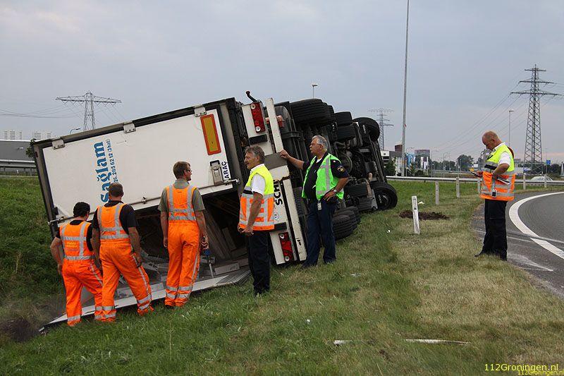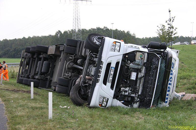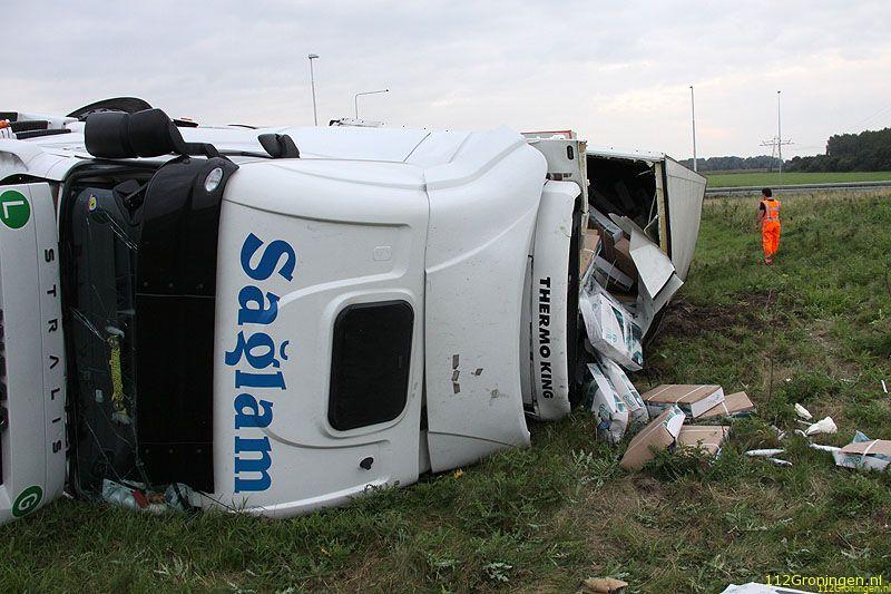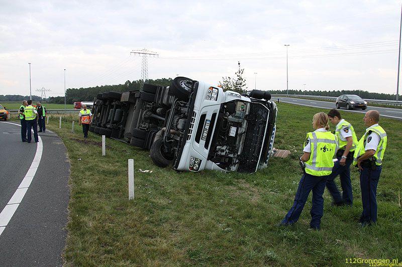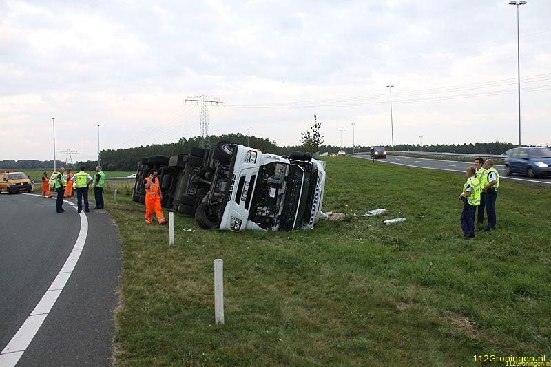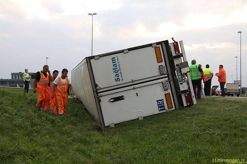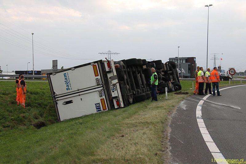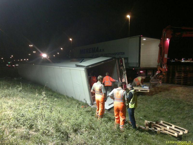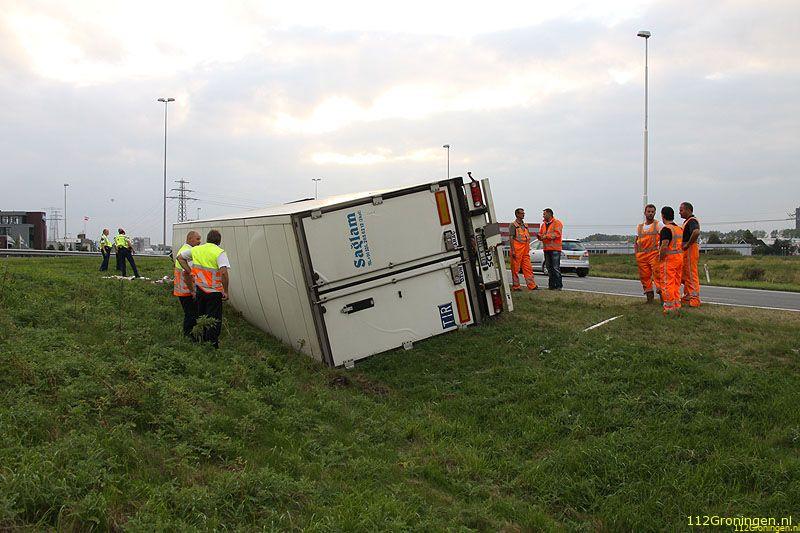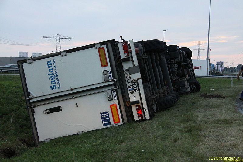 Groningen - Een vrachtwagen uit Turkije geladen met vis(makreel) is maandagavond op de ringweg(N46) bij Groningen gekanteld. Het ongeval gebeurde in de stijle bocht bij bedrijventerrein Driebond.