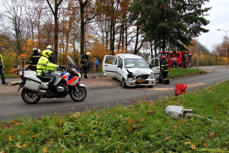 Veendam - Een automobilist is door nog een onbekende oorzaak frontaal in botsing gekomen met een verkeersbord en lantarenpaal.