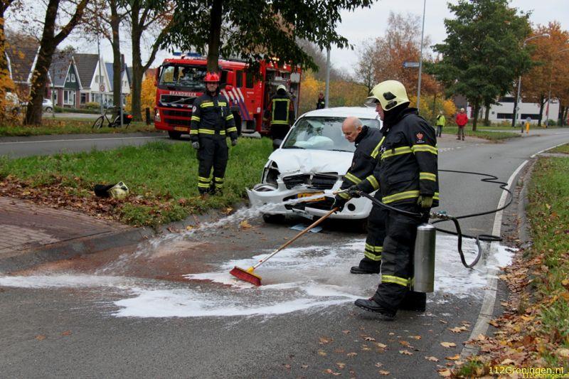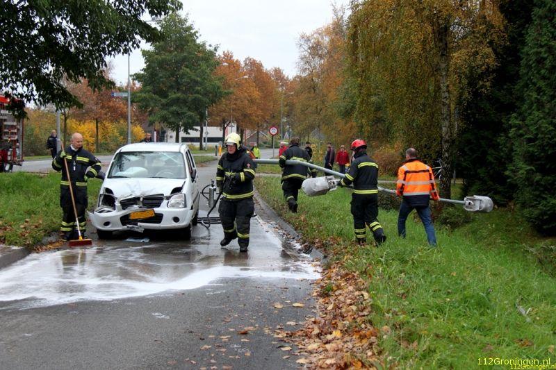 Door de klap brak de lantarenpaal dwars door midden. De auto kwam midden op de vluchtheuvel tot stilstand. De bestuurder kon zonder letsel het voertuig verlaten. Omdat er vloeistof uit de auto lekte heeft de brandweer het wegdek gereinigd.