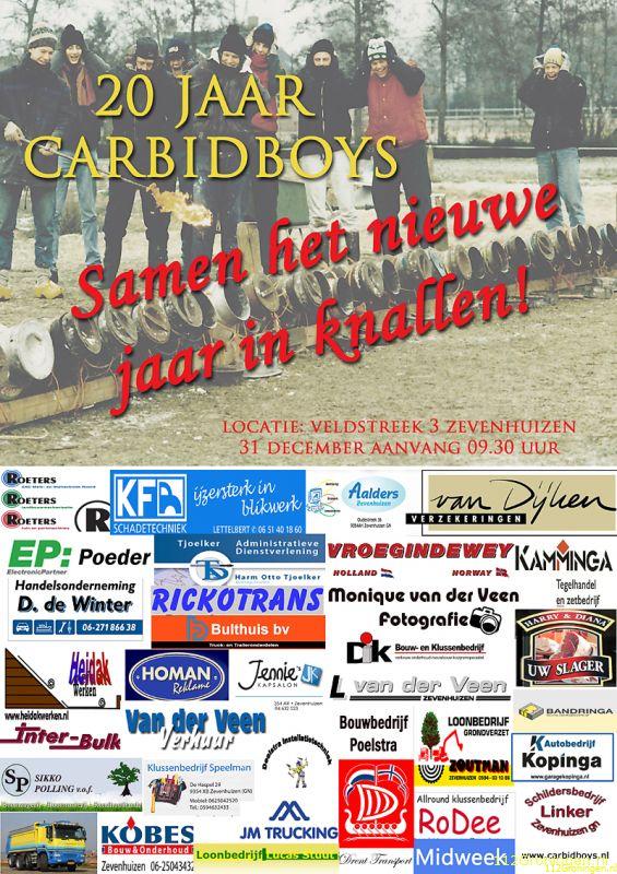 20 jaar geleden zijn de carbidboys begonnen. Simpel begonnen met een melkbus aan de Veldstreek. Nooit gedacht hebben dat dit zou uitgroeien tot hét oudejaarsevenement in Zevenhuizen en omgeving. Bijzonder is, dat de vriendenclub van toen nog steeds bij elkaar is! Enthousiast en met veel plezier kijken we weer uit naar deze leukste dag van het jaar! De 100 melkbussen staan weer klaar om afgeschoten te worden. De opbouw van het evenement zal de komende dagen vorm krijgen om klaar te zijn voor 20 jaar carbidschieten in Zevenhuizen.(31 December 2012)
