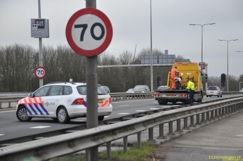 Een motorrijder was ten val gekomen. De achterliggende automobilist verklaarde dat het achterwiel plotseling blokkeerde en toen begon de motor te slingeren en viel de man. De man liep een sleutelbeenfractuur op. De politie zette tijdelijk 1 rijbaan af. Berger Poort uit Hoogkerk sleepte de motor af en Rijkswaterstaat maakte het wegdek schoon.