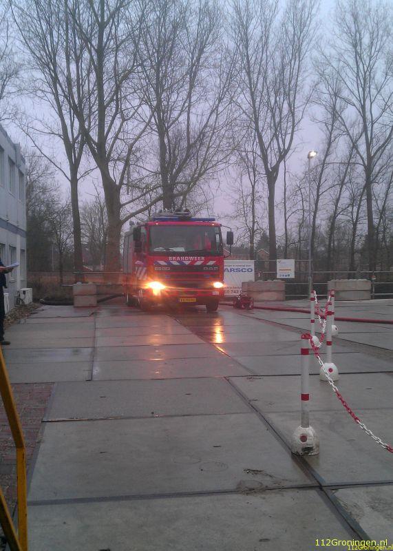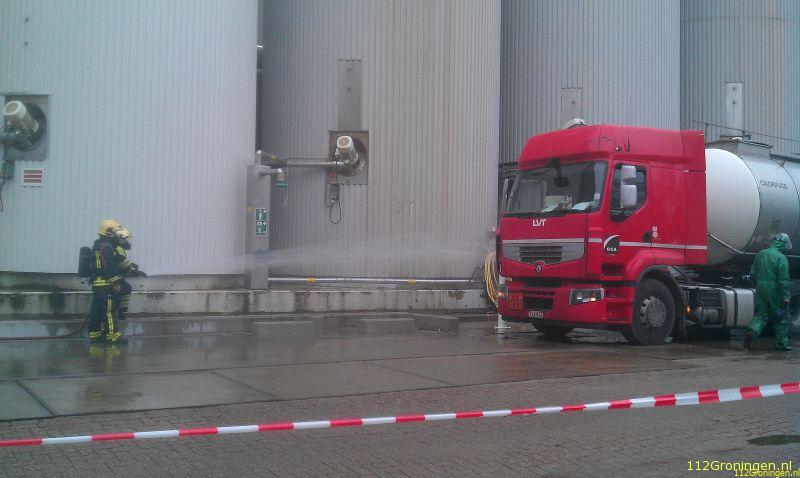 Een vrachtwagen lekte wat Salpeterzuur . De brandweer van Bedum heeft het lek verdund met een waterscherm. Achteraf viel het allemaal erg mee. Een minimale hoeveelheid kwam eruit. Een pakking van de tankwagen bleek lek te zijn. Het middel wordt voor schoonmaken gebruikt in de fabriek.