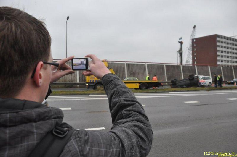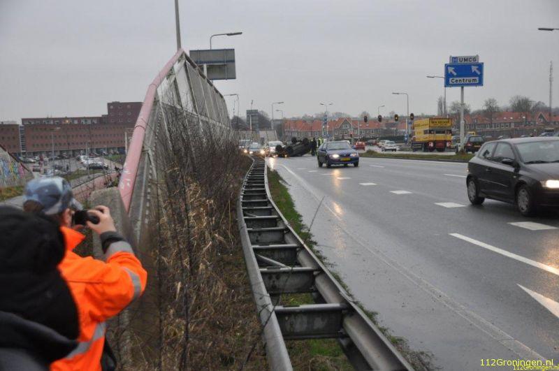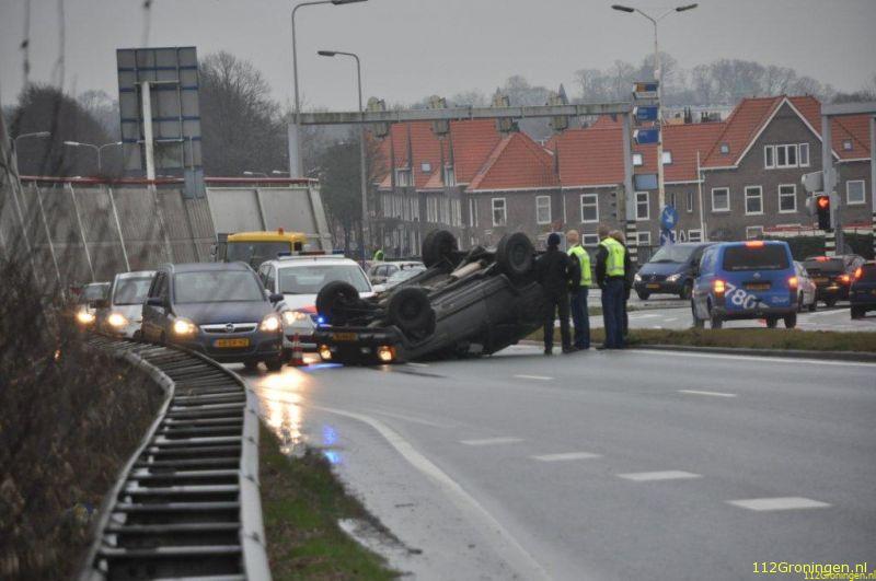 Groningen - Dinsdagmiddag om 14:15 uur lag er alweer een auto op de kop op de ringweg nabij de Bedumerweg. Dat gebeurt vaker op die plek.