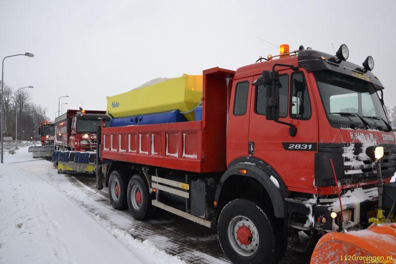 De mannen die route Bünde- Zuidbroek over de A7 doen en de mannen die de route over de N33 Siddeburen – bareveld doen zijn al om half 5 begonnen om de wegen schoon te maken voor het verkeer, wij mochten een ochtend mee met de firma Haan Kippertransport De ochtend begon vroeg, De gladheidscoördinator van Rijkswaterstaat belt naar SITA Recycling Noord Nederland (Hoofdaannemer van Rijkswaterstaat) om de strooiactie op te starten en die gladheidscoördinator van SITA Recycling belt naar de chauffeurs, die daarna binnen anderhalf uur gereed moeten zijn om de weg op te kunnen, dat betekend dat hun vrachtwagen dan klaar moet zijn met alles erop en eraan dus een sneeuwschuiver en een strooimachine, de sneeuwschuivers kunnen een breedte van 5.20 meter hebben en de strooimachine had een inhoud van 9 kuub.