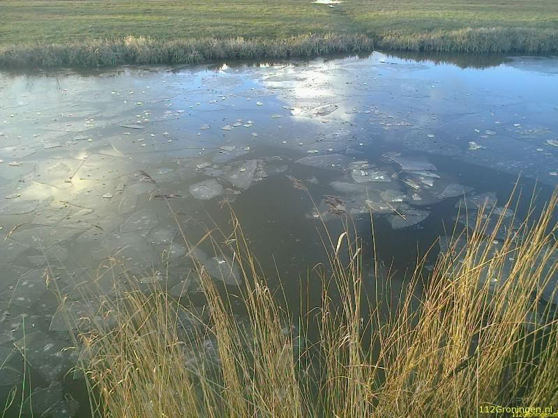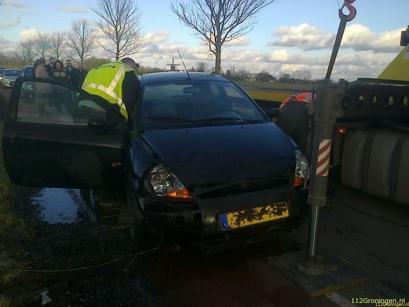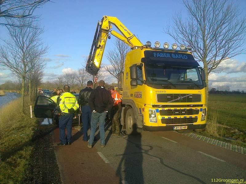 Feerwerd - Donderdagmiddag is de bestuurster van dit voertuig met de schrik en een nat pak vrij gekomen na een plons im het ijskoude Reitdiep.