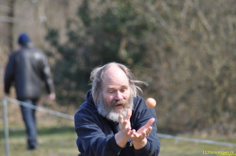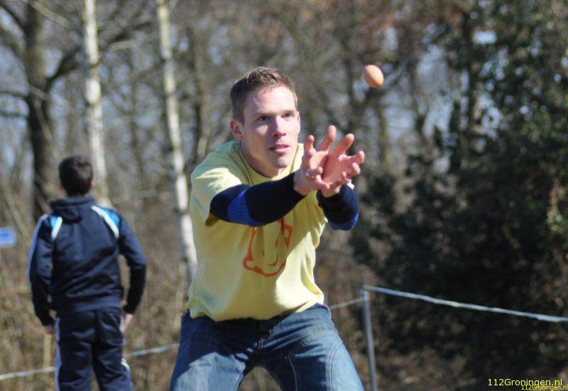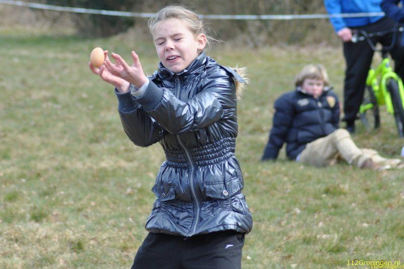 Ondanks de frisse wind waren er weer vele deelnemers op het evenement afgekomen. Er werd voor de kleinsten gestart met eieren lopen, met een ei op een lepel moest een parcours afgelegd worden, zonder dat het ei er afviel. Tussendoor vond het eieren zoeken plaats, er werd natuurlijk gretig gezocht naar de lekkere chocolade eieren.Vervolgens werd er aangevangen met het spectaculaire eiergooien. Een ieder kreeg kans om 3 eieren over een bepaalde afstand te gooien, waarbij deze heel gevangen moest worden. Na elke ronde werd de afstand vergroot, waarbij het natuurlijk steeds veel vaker misging, maar dat mocht zeker de pret niet drukken.