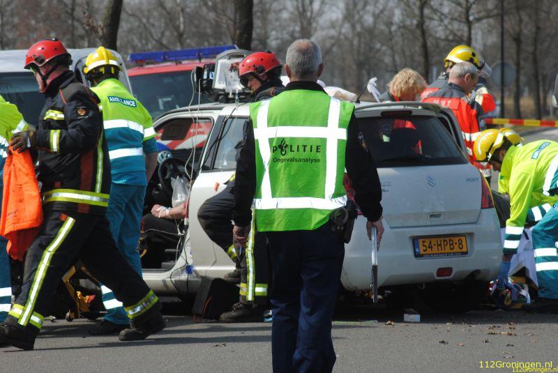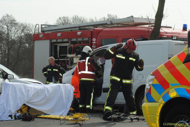 De auto’s kwamen nagenoeg frontaal met elkaar in botsing. Twee personen moesten uit de personenauto worden geknipt door de brandweer. De bestuurder van het busje kon met hulp uit zijn voertuig worden gehaald. De politie heeft de sporen van het ongeval vast gelegd voor hun verslag.