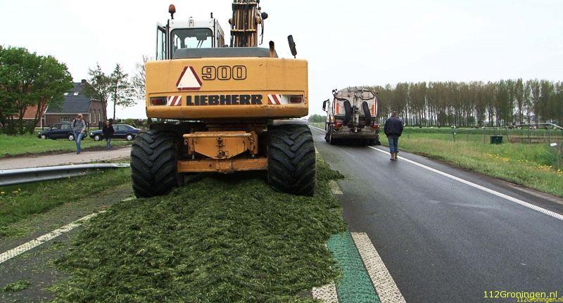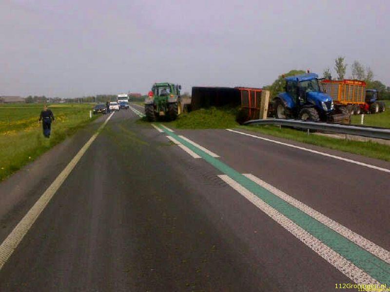 Appingedam - De N33 tussen Holwierde en Appingedam is meer dan een uur afgesloten geweest nadat een aanhanger achter een tractor met gras  omviel en op de vangrail terecht kwam.