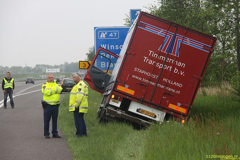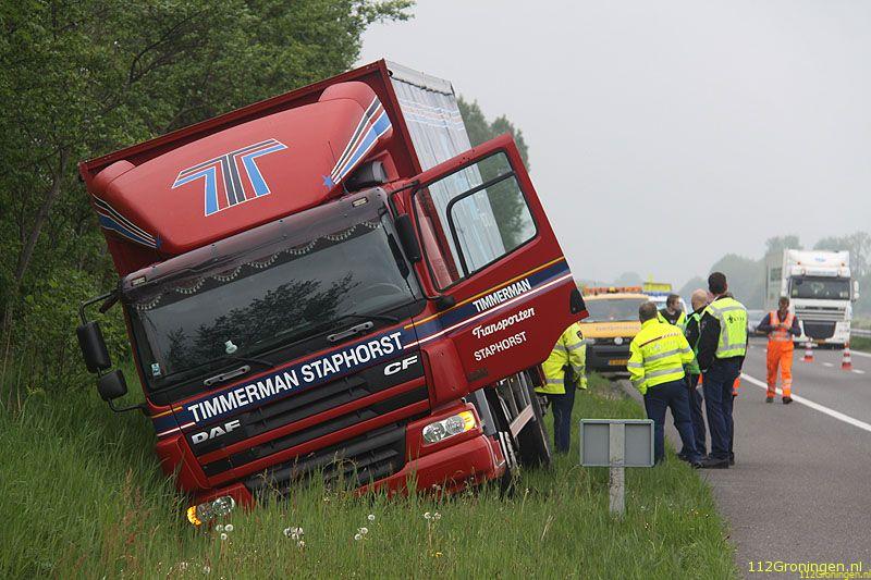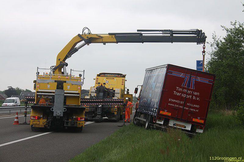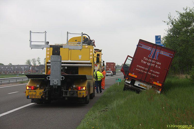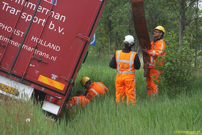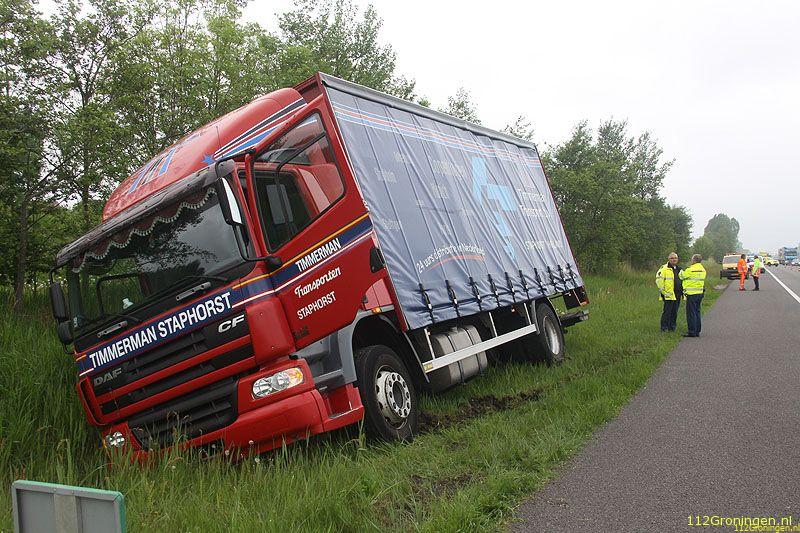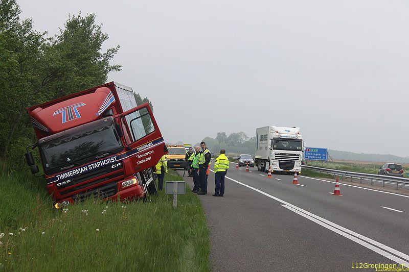 Winschoten - Bij de afslag Winschoten op de A7 is dinsdagochtend een vrachtwagen voor een deel in de sloot geraakt.