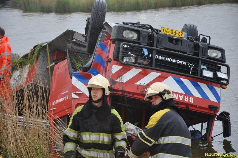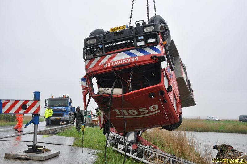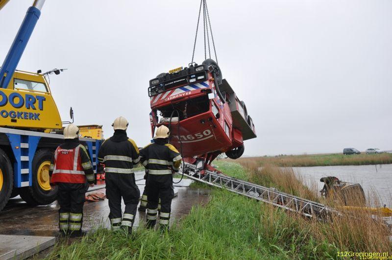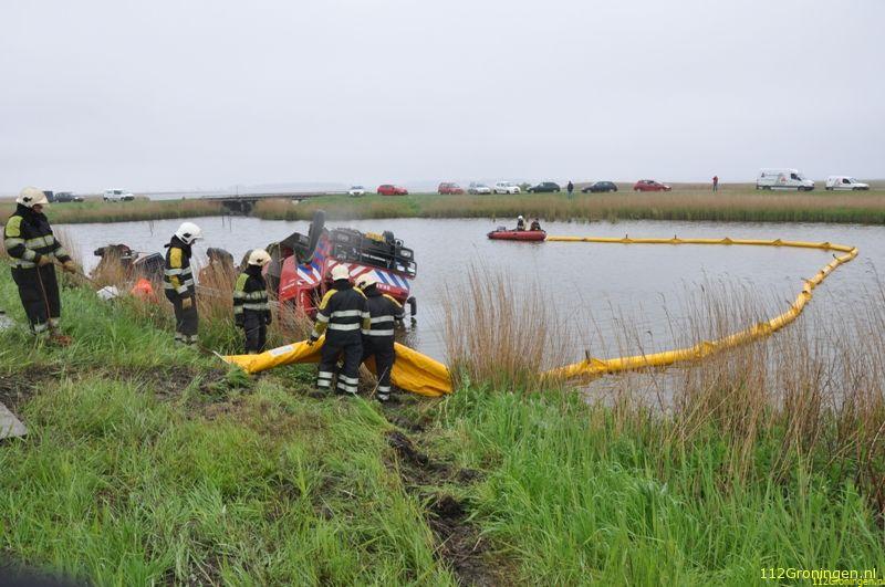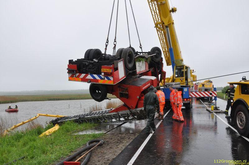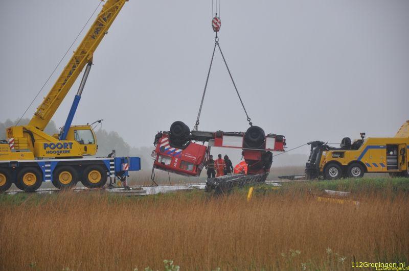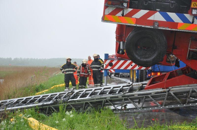 Lauwersoog - Op de terugweg van het Pinksterkamp ging het dinsdagmiddag mis. Door een stuurcorrectie na de berm geraakt te hebben kantelde de wagen. De autoladder deed 27 jaar lang dienst bij het brandweerkorps Delfzijl als regionaal voertuig.