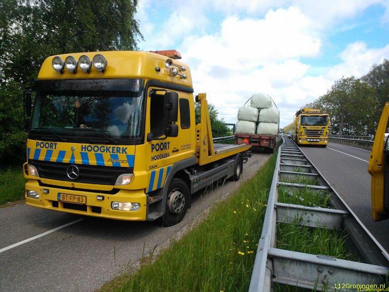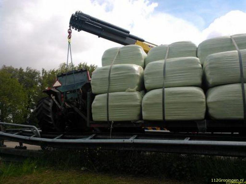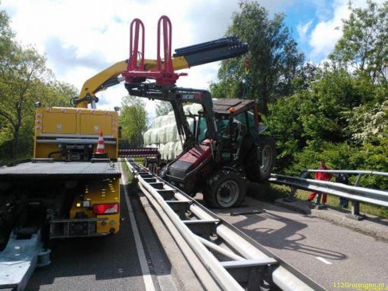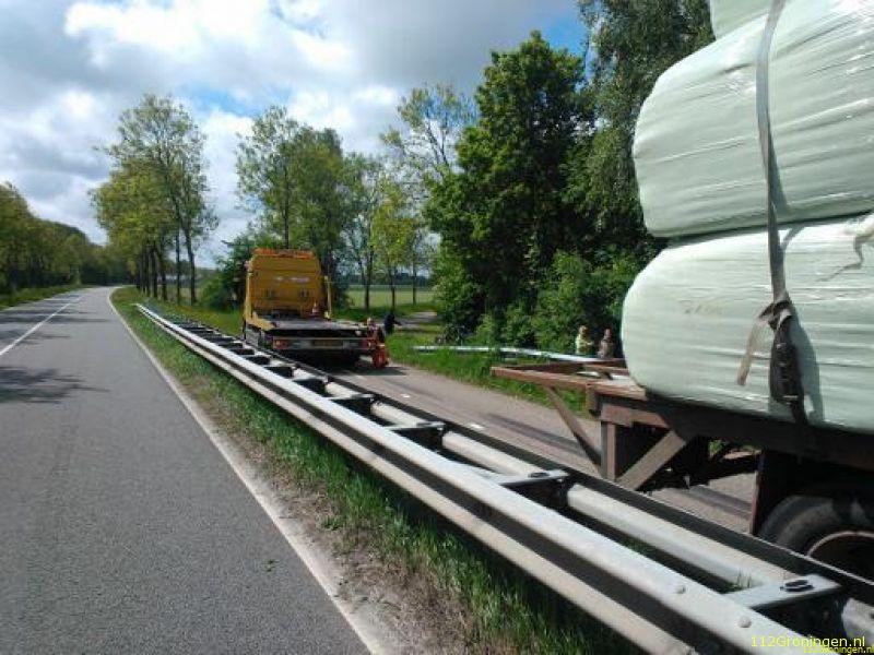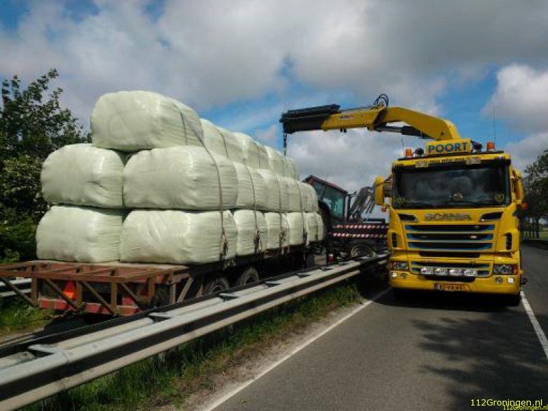 Mensingeweer - Trekker geschaard bij Mensingeweer. Een trekker met aanhanger, geladen met balen gras is maandagmiddag geschaard t.h.v het nw. gemaal op de N361.