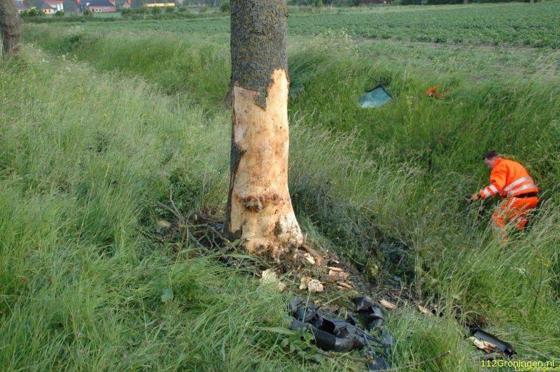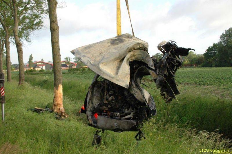 De wagen brak daarbij doormidden waarna een deel van de auto in brand vloog. De provinciale weg was door het ongeluk tot half negen voor het verkeer afgesloten. De verkeersspecialisten van de politie doen verder onderzoek naar de toedracht. De politie komt graag in contact met mensen die het ongeluk hebben zien gebeuren of de auto, een donkerkleurige Porsche, hebben zien rijden. Er kan worden gebeld met 0900-8844.