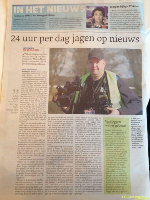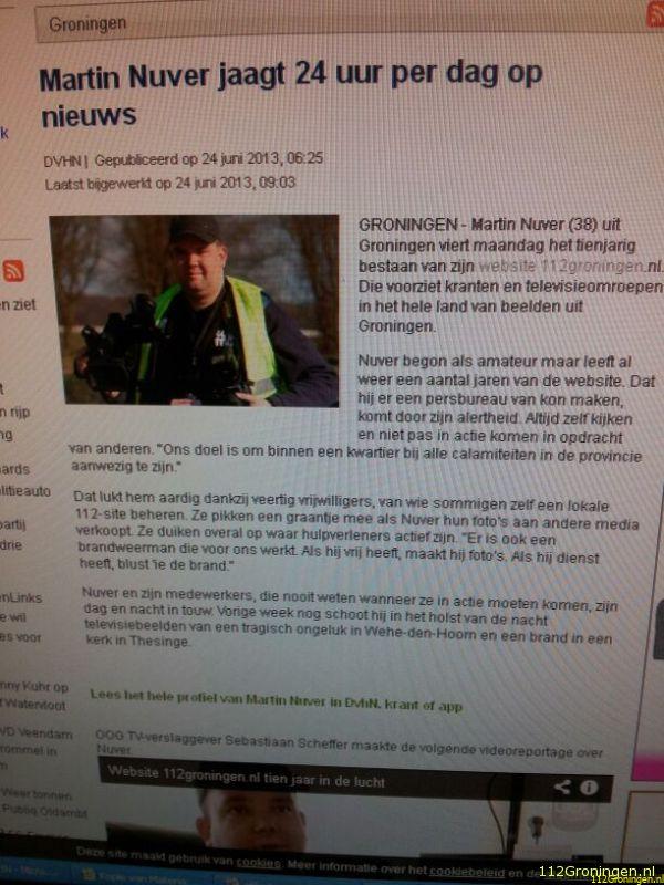 Mijn eerste foto stond in augustus 1999 in het Nieuwsblad van het Noorden. Van een brand in de Noorderstationsstraat in Groningen. Filmpjes liet ik ontwikkelen bij Merema in Paddepoel, de foto’s bracht ik naar de krant. Later ontwikkelden ze daar de filmpjes voor mij omdat het anders veel te duur werd. De digitale fotografie heeft het voor ons allemaal een stuk gemakkelijker en het nieuws sneller gemaakt.” Voor smartphones ontwikkelt Nuver nu een app . Hij wil ook weer aan de slag met de website 112Nederland. Eerdere pogingen om daar een groot succes van te maken, de afgelopen tijd had een ander bedrijf de naam in bruikleen, strandden. “We gaan rustig proberen om daar net zo’n succes van te maken als van 112groningen. Maar het is lastig om een landelijk netwerk op te bouwen. En kijkers zijn ook niet meteen enthousiast. Mensen zijn meer geïnteresseerd in hun eigen regio.”