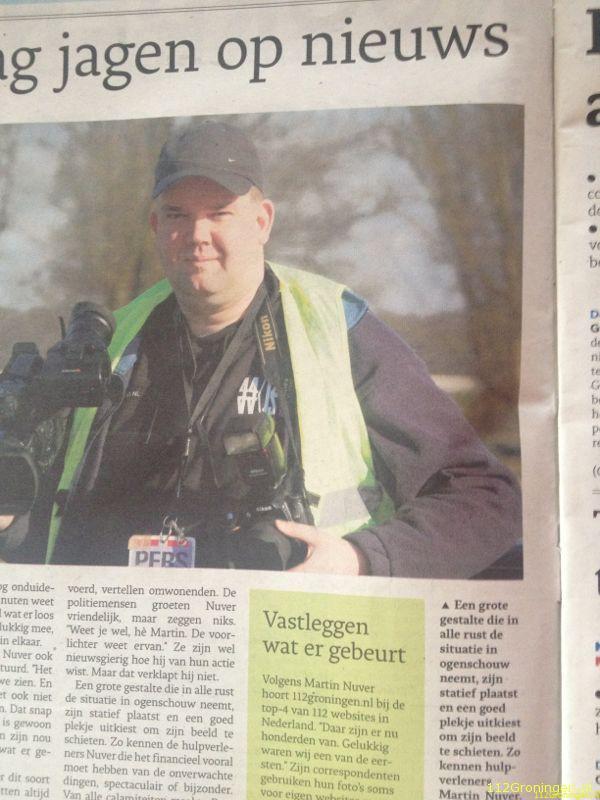 We hebben ruim 40.000 unieke bezoekers per dag. Maar na zo’n tragisch ongeluk als in Wehe is de belangstelling drie tot vier keer zo groot. De video op onze website is 20.000 keer bekeken.” Door zijn lange staat van dienst krijgt Nuver vrijwel dagelijks tips van burgers. Ook deze middag. “Veel sirenes op het Sontplein, Martin. Als er dadelijk een melding komt, is het serieus!”, meldt iemand aan de telefoon. Nuver hoort het in alle rust aan en wacht af. Het blijft stil…. Even later gaat hij wel naar Hoogkerk. Er zijn niet-alledaagse veel agenten op de been. Die zijn agenten verrast als ze Nuver uit zijn auto zien stappen. Er is net een inbreker afgevoerd, vertellen omwonenden. De politiemensen groeten Nuver vriendelijk, maar zeggen niks. “Weet je wel hè Martin. De voorlichter weet ervan.” Ze zijn wel nieuwsgierig hoe hij van hun actie wist. Maar daar verklapt hij niet. Een grote gestalte die in alle rust de situatie in ogenschouw neemt, zijn statief plaatst en een goed plekje uitkiest om zijn beeld te schieten. Zo kennen de hulpverleners Nuver die het financieel vooral moet hebben van de onverwachte dingen, spectaculair of bijzonder. Van alle calamiteiten maakte Project X in Haren de meeste indruk op Nuver. “Ik ben daar alleen voor onze eigen website geweest omdat de andere media daar allemaal zelf waren. Door mijn lens zag ik mijn auto tussen die raddraaiers en de ME staan. Een auto ernaast ging op de kop. Op mijn auto zat alleen een krasje op het merkteken. Als ze hem hadden aangestoken, had ik niks kunnen doen. Dat was heftig. En Wehe, vorige week, was denk ik het ergste waar ik die tien jaar ben geweest.” Het grootste gevoel van onmacht had Nuver toen hij vrij kort na de oprichting van 112Groningen werd opgepakt op verdenking van brandstichting. De politie bracht dat naar buiten nadat hij alweer op vrije voeten was. Hij bleek onschuldig. Drie pyromanen, die later werden veroordeeld, hadden hem vals beschuldigd. Nuver kreeg tot zijn verbazing nooit excuses of een schadevergoeding. “Ik heb er twee jaar last van het gehad. Tot op de dag van vandaag ben ik doodsbenauwd dat ik een keer zaken doe met iemand die iets heeft aangestoken. Je kunt er niets aan doen en het komt ook bij de brandweer voor, maar ik zou het verschrikkelijk vinden. Het is mijn nachtmerrie.” Nuver liftte mee met de opkomst van de digitale techniek. “Toen ik dertien was, ging ik al bij hulpverleningen kijken en fotograferen.