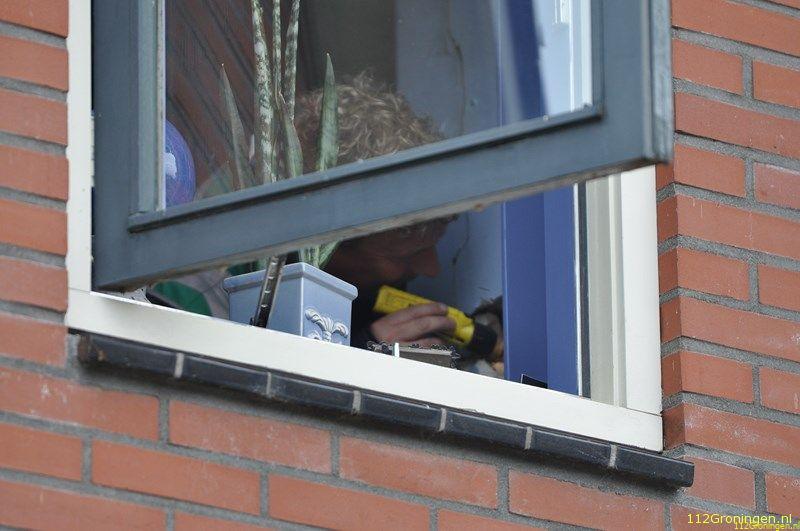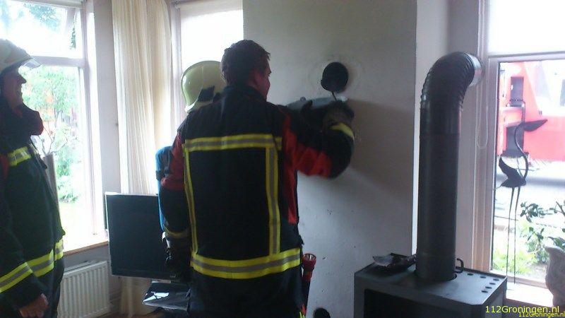 Ter plaatse trof men een sterk rokende schoorsteen aan en moest de brandweer wachten op de hoogwerker van de brandweer Groningen, die overigens ook snel ter plaatse was.
