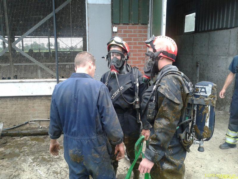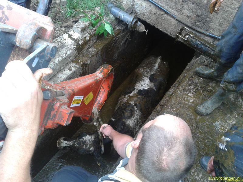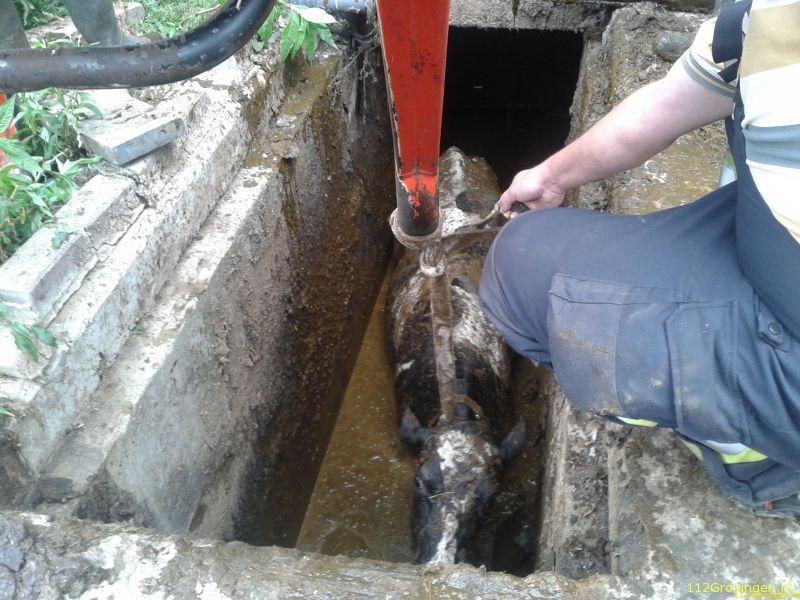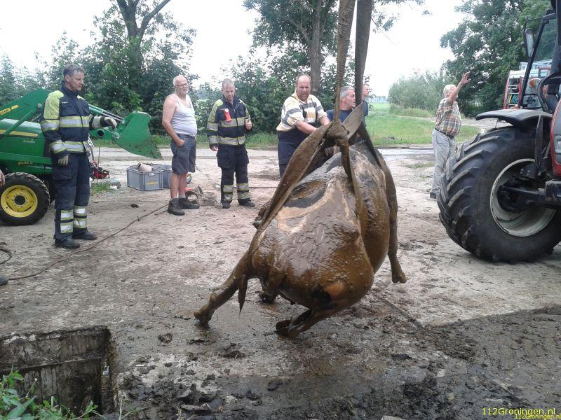 De koe zat in een mestkelder en kon er niet meer uitkomen. De koe heeft er ook al even ingezeten voordat de boer hem ontdekt had. Na enig gedoe lukte het de brandweer om samen met de boer de koe uit de kelder te halen.