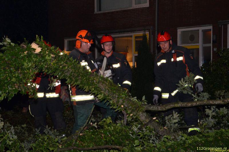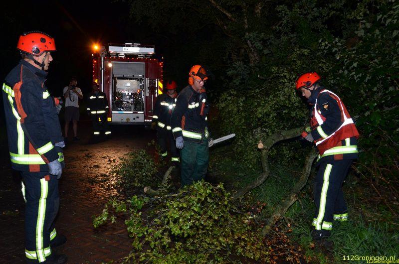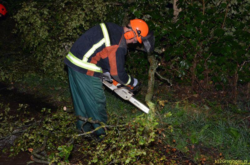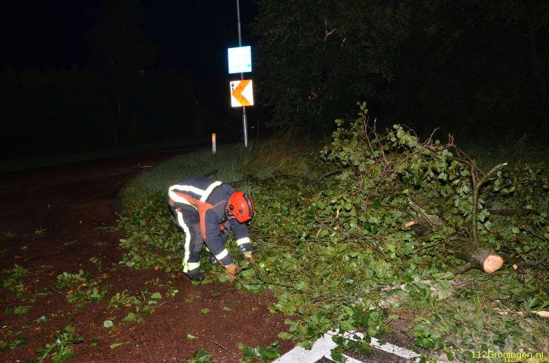 Nadat deze boom snel en vakkundig was geruimd, kon de brandweer direct door naar de Noorderweg in Midwolde. Ter plaatse leek een kleine windhoos over dit gebied getrokken te zijn, waarbij diverse bomen geveld waren.