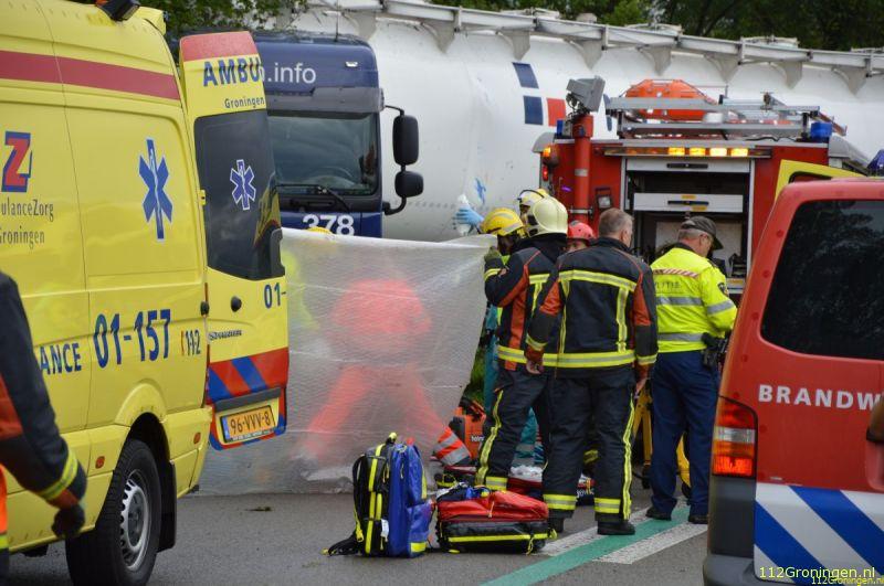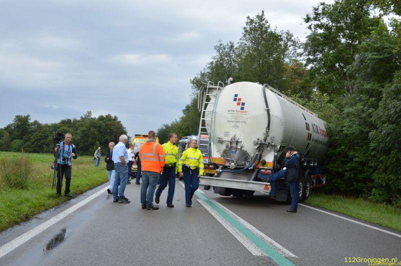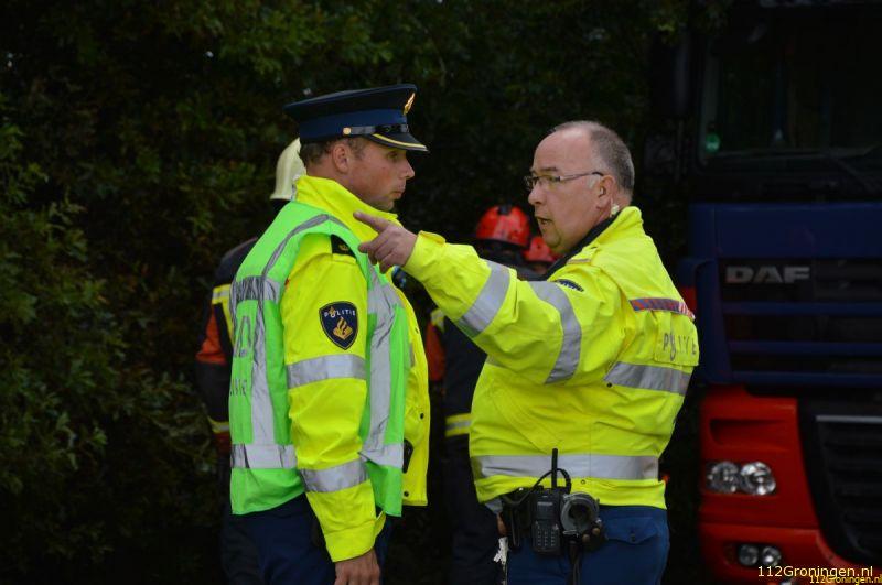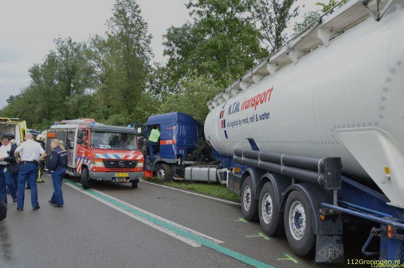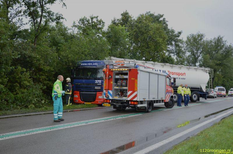 Een trekker met oplegger kwam haar tegemoet. De bestuurder van de combinatie, een 53-jarige man uit Westendorp, kwam door nog onbekende oorzaak met de rechterwielen in de berm terecht. Na een correctie stuurde hij de weg weer op. Recht op een tegemoetkomende personenauto af. De bestuurster van deze auto, een 41-jarige vrouw uit Oude Pekela, reed de berm in om een aanrijding met de vrachtwagencombinatie te voorkomen. Daarbij raakte ze een boom en schoot weer terug de rijbaan op. De vrouw liep daarbij geen letsel op. De vrachtwagencombinatie schaarde vervolgens en raakte de auto van de tegemoetkomende Groningse automobiliste. Deze raakte daarbij bekneld. Ze is per ambulance naar het UMCG gebracht met twee gebroken polsen.