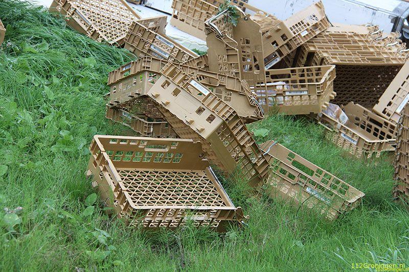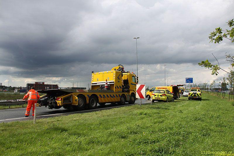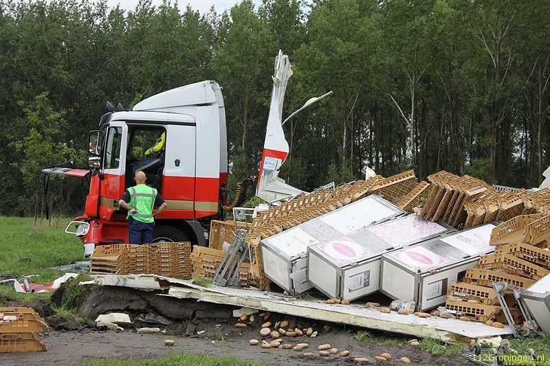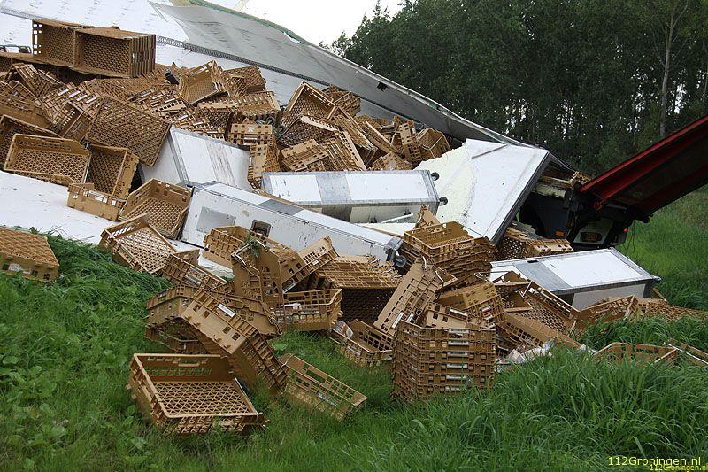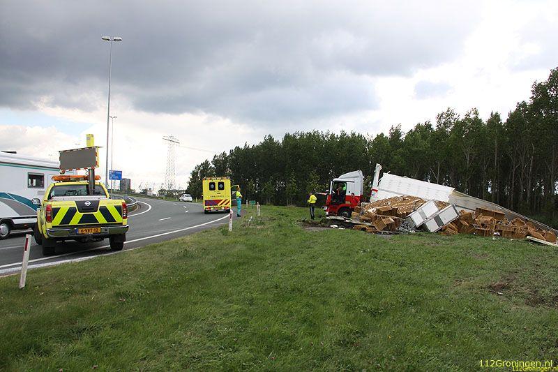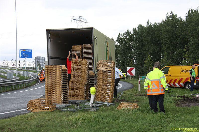 Groningen - Op de oprit van de ringweg rond Groningen is maandagmiddag een vrachtwagen geladen met brood en lege broodkratten gekanteld.
