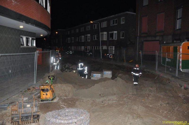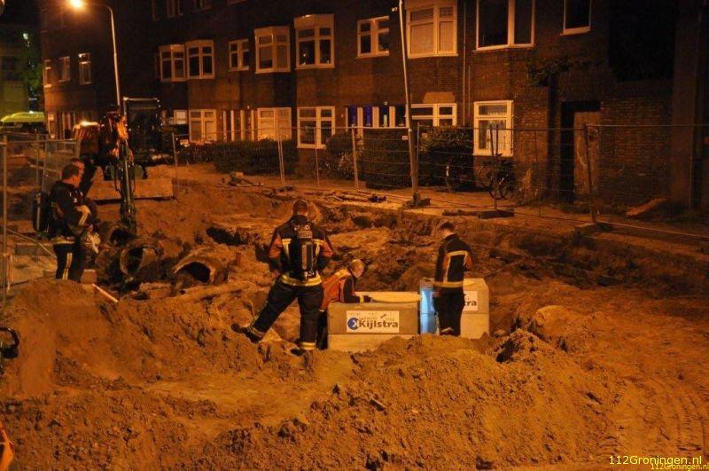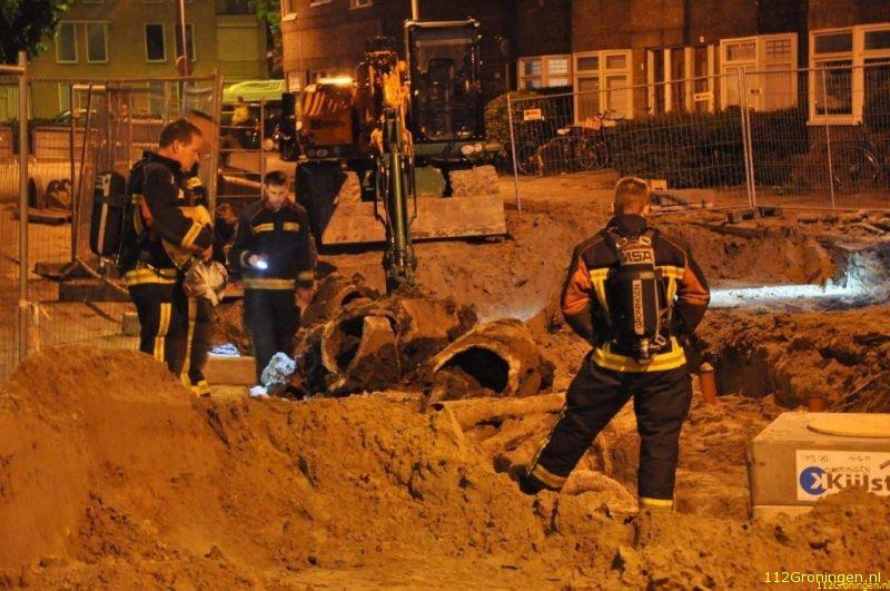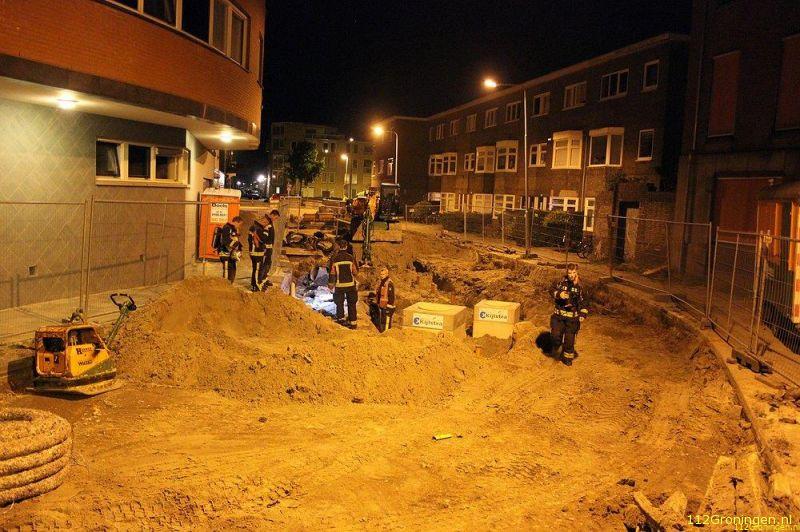 Bij aankomst werd er een sterke gaslucht geroken bij graafwerkzaamheden en ging men op onderzoek uit om de bron te achterhalen. Op de hoek van de straat lag een oude gasleiding en daar werd ook de stank het sterkst geroken, de concentratie gas was niet sterk genoeg om te meten.