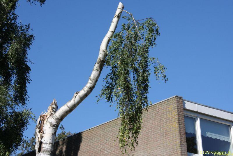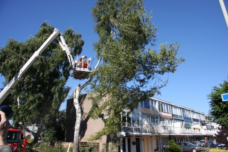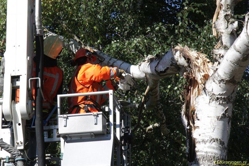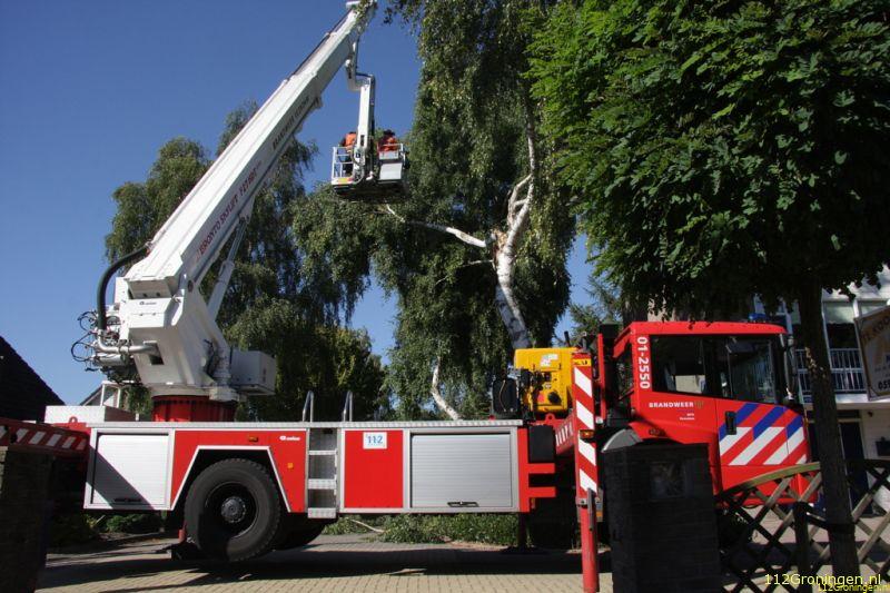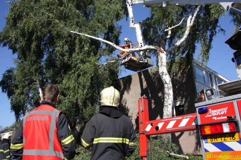 Een grote tak van een Berkenboom was afgescheurd en leunde op een naastgelegen boom. Met behulp van de hoogwerker werd de volledige boom stukje bij beetje geveld. Nadat het gevaar was geweken en de rommel was opgeruimd, kon de brandweer na een glaasje fris van een buurtbewoner terugkeren naar de kazerne.