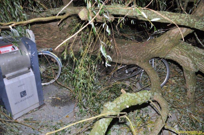 Ze zouden even een biertje drinken in de kroeg en zetten hun fiets in het Plantsoen neer. Opeens hoorden ze krak en er kwam een boom van 30 meter naar beneden die hun fiets verpletterde en bijna hunzelf.